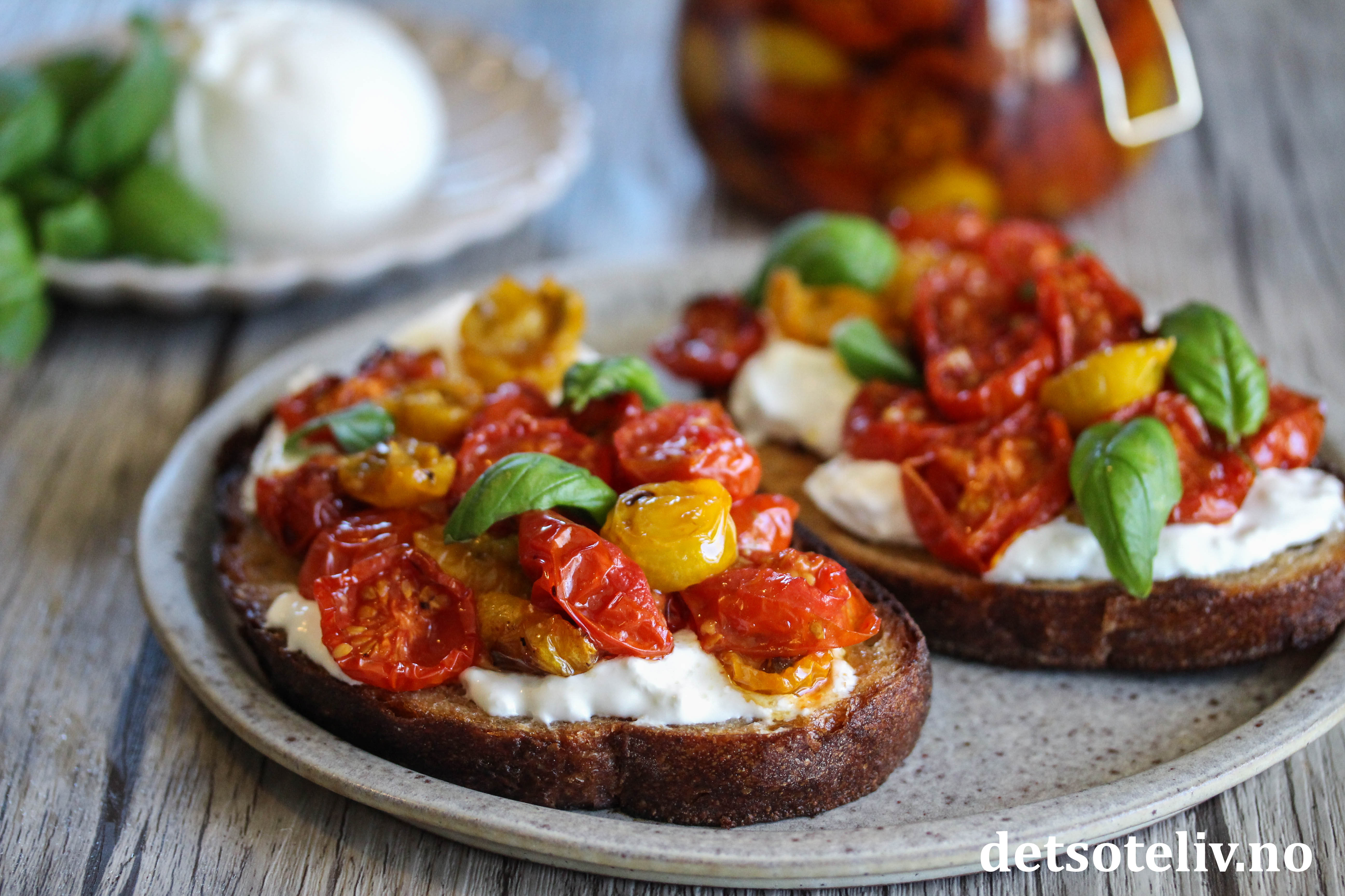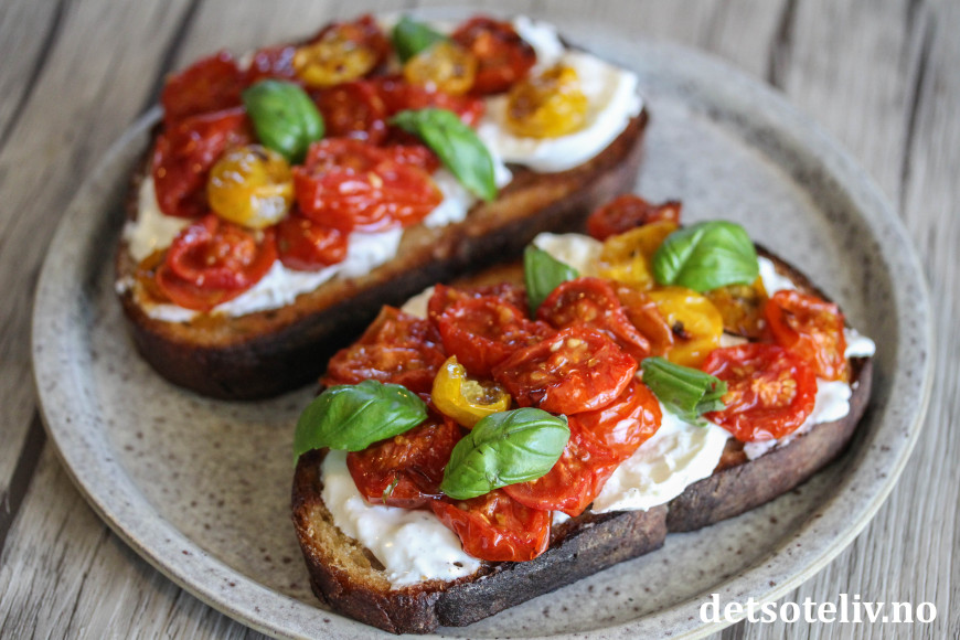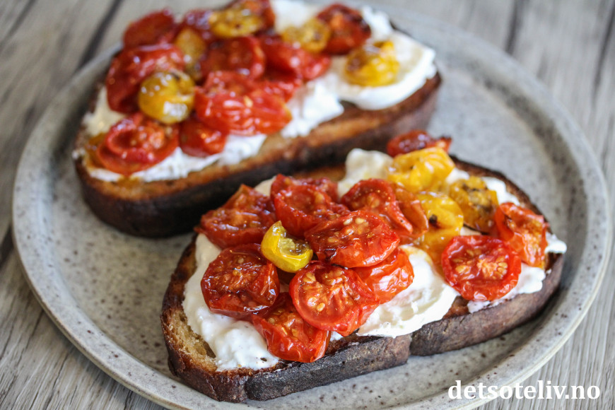 Smørstekte toast, som gnis inn med hvitløk og så dekkes med kremete burrata og konfiterte tomater... say no more!
