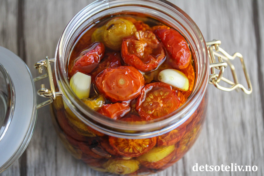 ♥ Konfiterte tomater: Jeg bruker her hjemmelagde ovnsbakte cherrytomater som jeg legger på glass med hvitløk og olivenolje (kalles gjerne også for konfiterte tomater). Dette er noe jeg lager ganske ofte slik at jeg har det tilgjengelig i kjøleskapet. Se oppskrift på dette i innlegget HER.