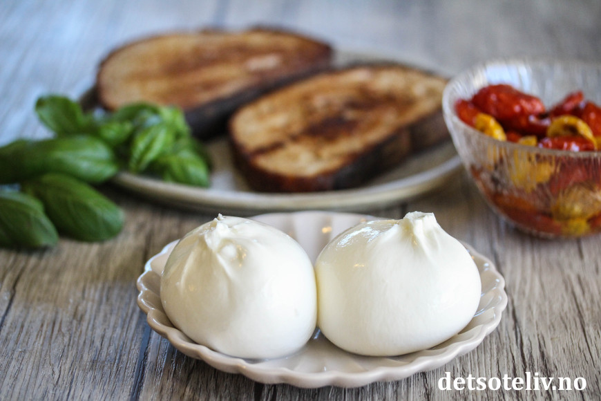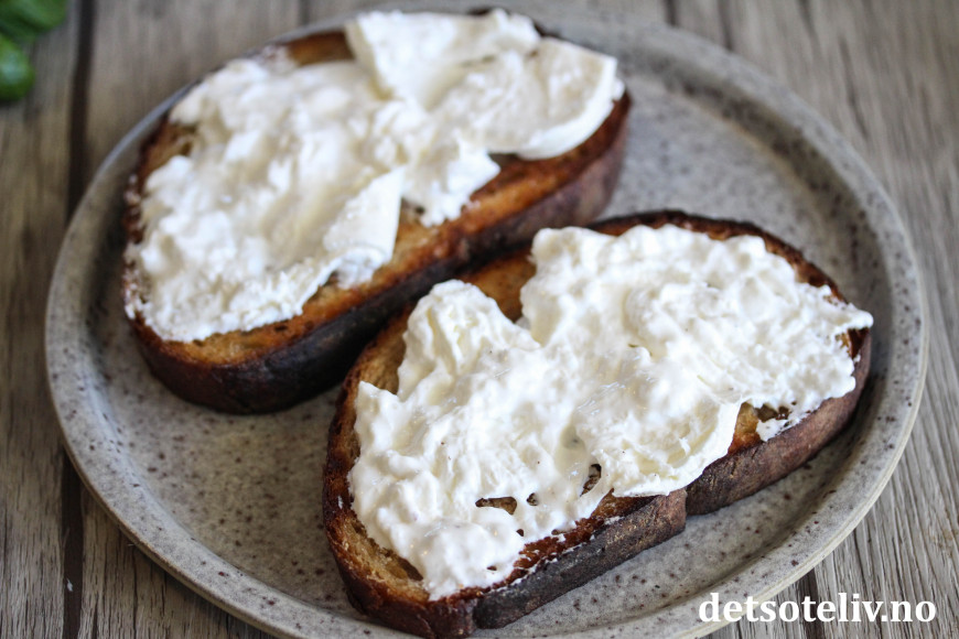 Jeg bruker her burrata på toasten, som jeg liker aller best, men det blir også veldig godt på toast å bruke skiver av vanlig mozzarella.