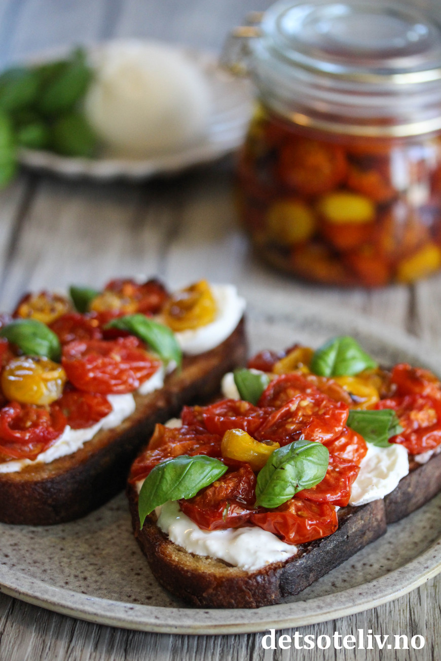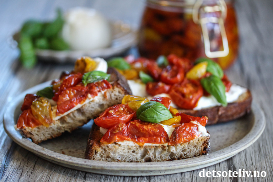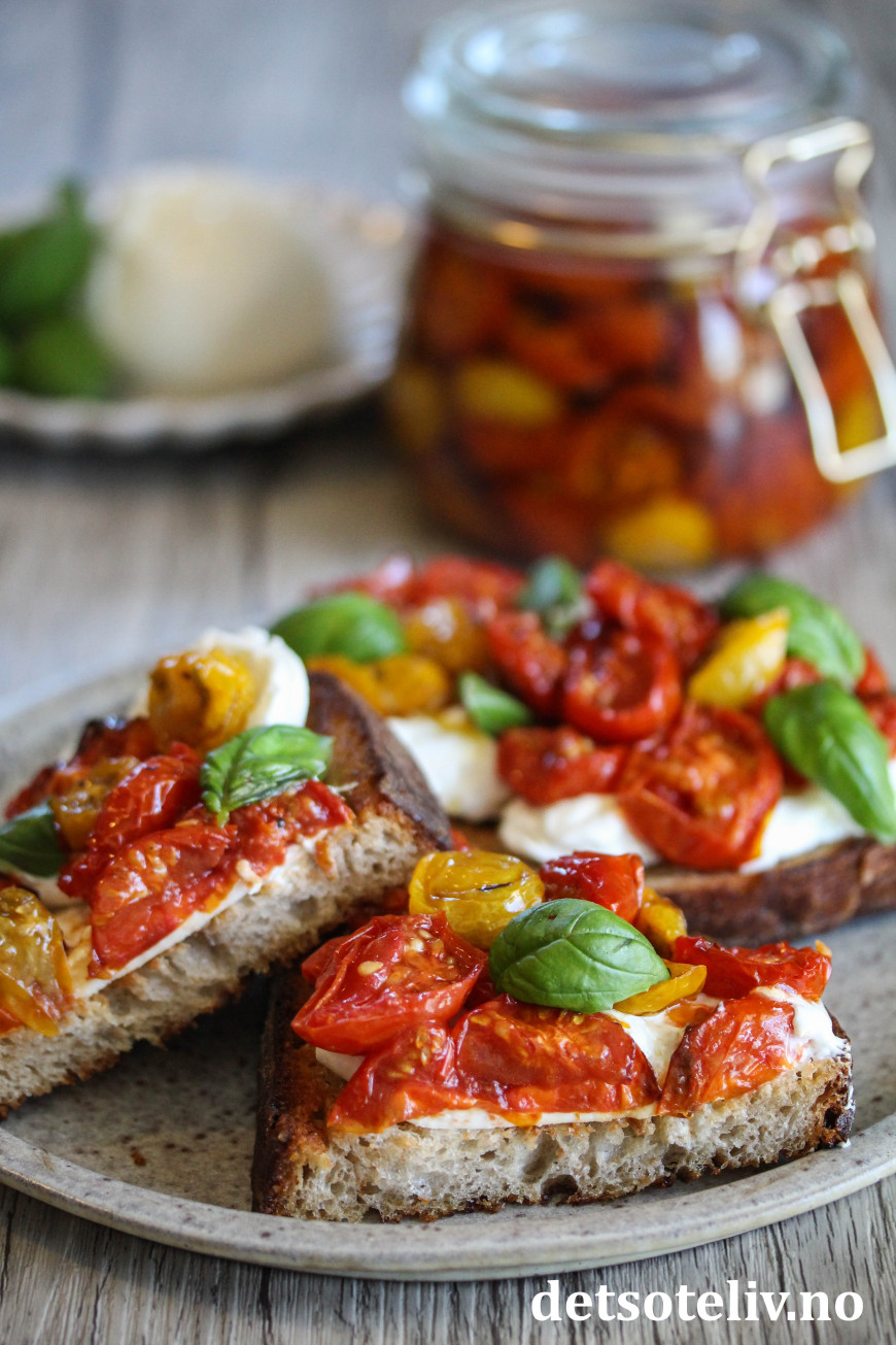 Legg på rikelig med konfiterte tomater og ta også med noe av den nydelige olivenoljen som tomatene ligger i.