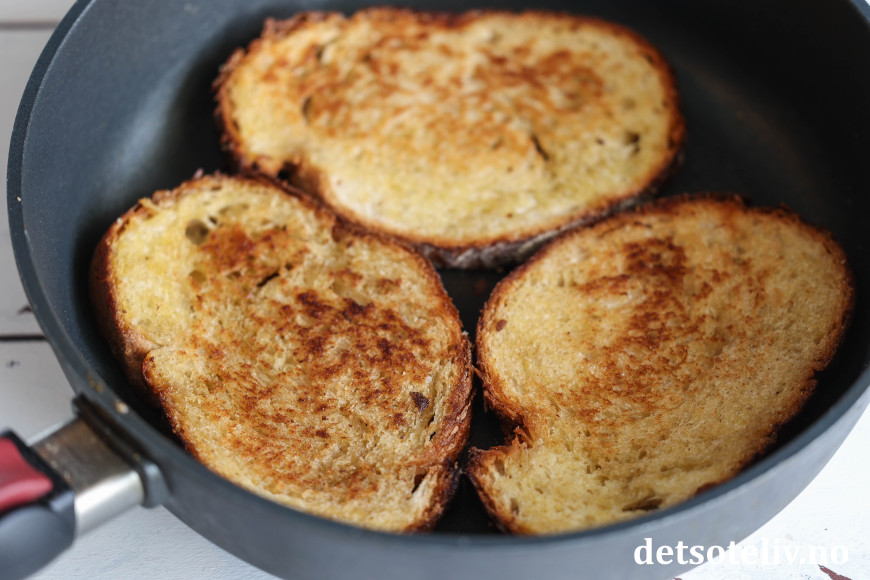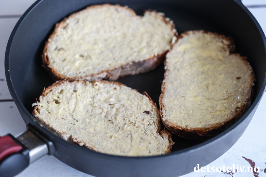 Smør brødskivene med smør på begge sider. Stek dem i stekepanne på middels varme, slik at de blir sprø og gylne på begge sider.