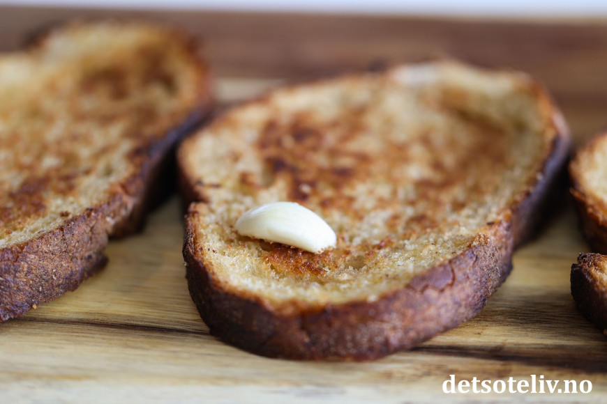Skjær et hvitløksfedd på midten og gni snittsiden på hvert halve hvitløksfedd mot hver av toastene (dette gir et deilig hint av hvitløk).