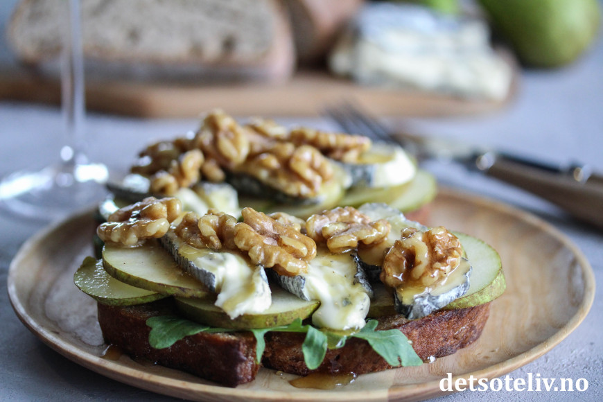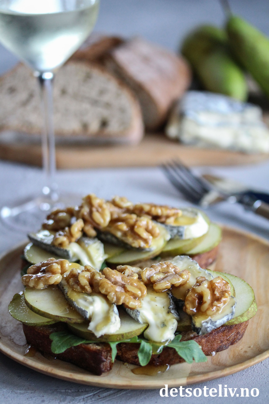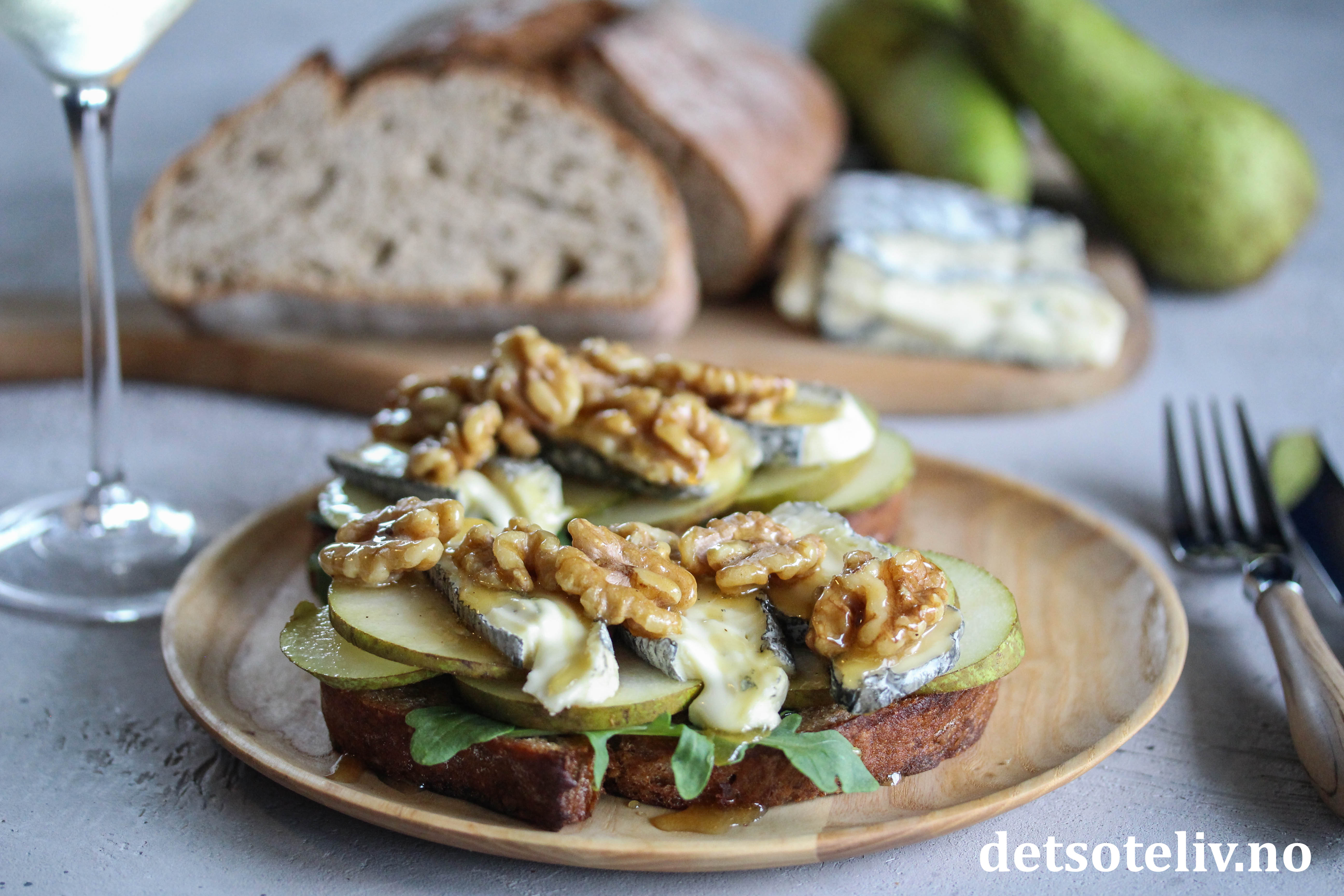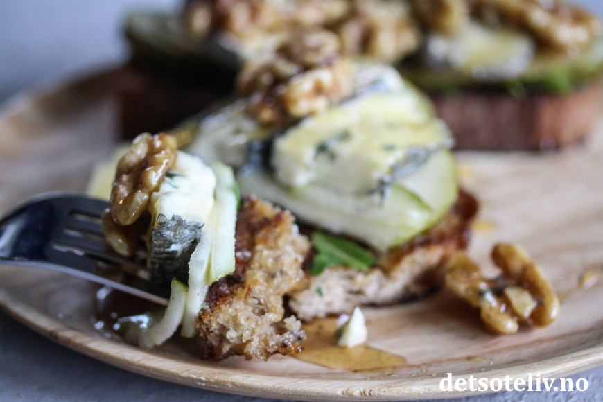 Pære, blåmuggost, valnøtter og honning er så godt sammen! Her på toppen av sprøstekt toast.