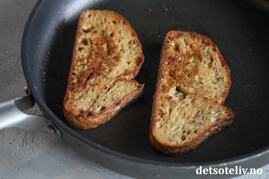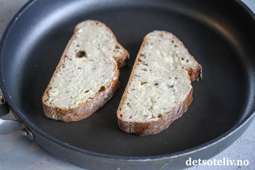 Smør brødskivene med smør på begge sider. Stek skivene i stekepanne på middels varme til de blir gylne og sprø.