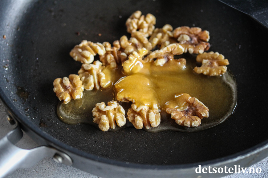 Ha valnøttene i en stekepanne sammen med honning. Varm opp på middels varme til honningen blir flytende og nøttene karamelliserte.