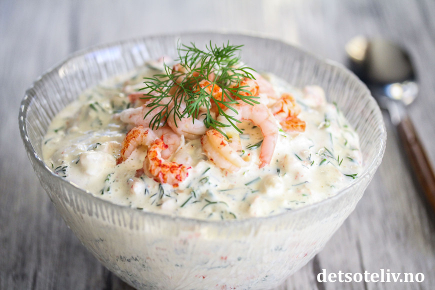 Pynt med noen hele reker, en teskje løyrom (eller annen rogn) og dill.