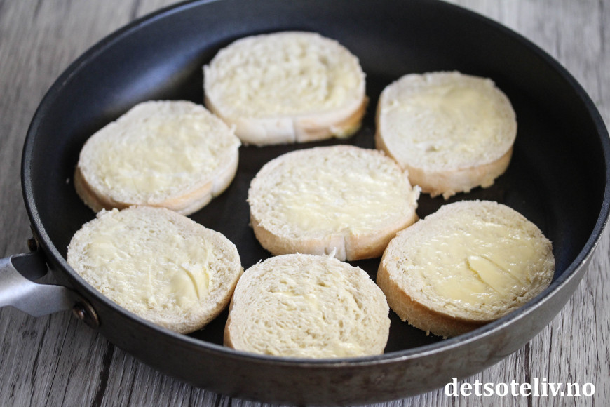 Stek brødskivene i stekepanne på middels varme til de blir gylne og sprø på begge sider.