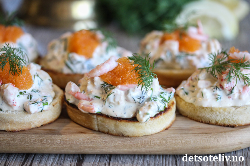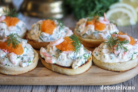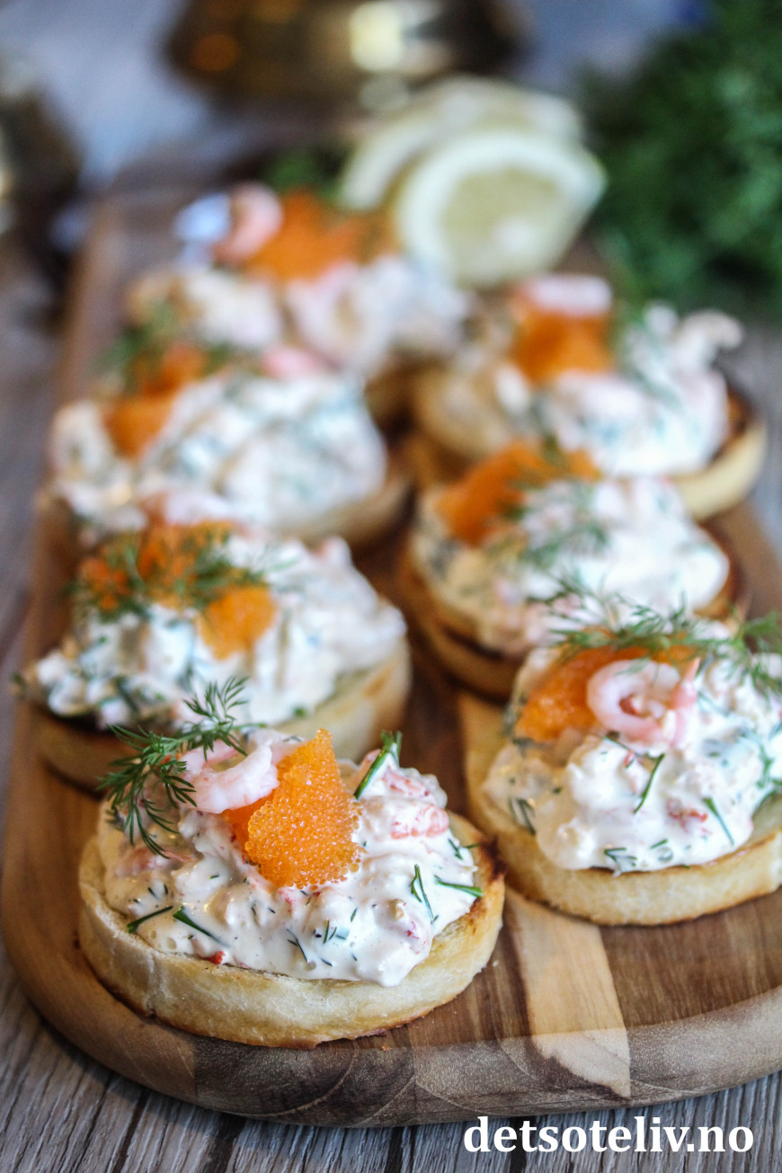 Her dekkes sprøstekt toast med Skagenrøre, som er en deilig påleggssalat med reker, krepsehaler og rogn.