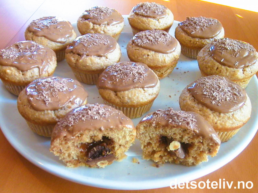 Stek på rist midt i ovnen ved 180°C i ca 20 min (sjekk med kakenål). Avkjøl muffinsene litt i formen. Løsne dem fra kanten av formen med en skarp kniv og hvelv dem så forsiktig ut av muffinsbrettet.