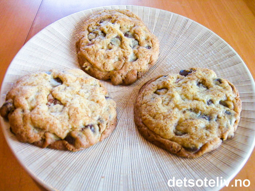 I cookiesene på bildet har jeg brukt ekte, amerikanske chocolate chips ("Toll House real semi-sweet chocolate morsels" fra Nestlé). Disse er en god del større enn de norske sjokoladedråpene (fra Freia), som fås kjøpt i vanlige norske matvarebutikker. Amerikanske chocolate chips fås blant annet kjøpt hos matvarekjeden Centra og i noen av butikkene til Deli de Luca (1 pk = 340 g). Får du ikke tak i disse, er grovt hakket kokesjokolade et godt alternativ.