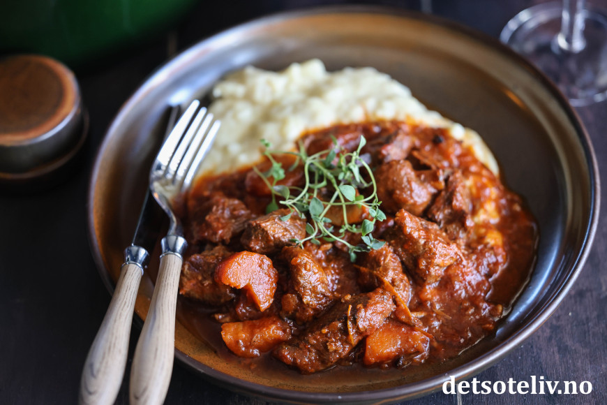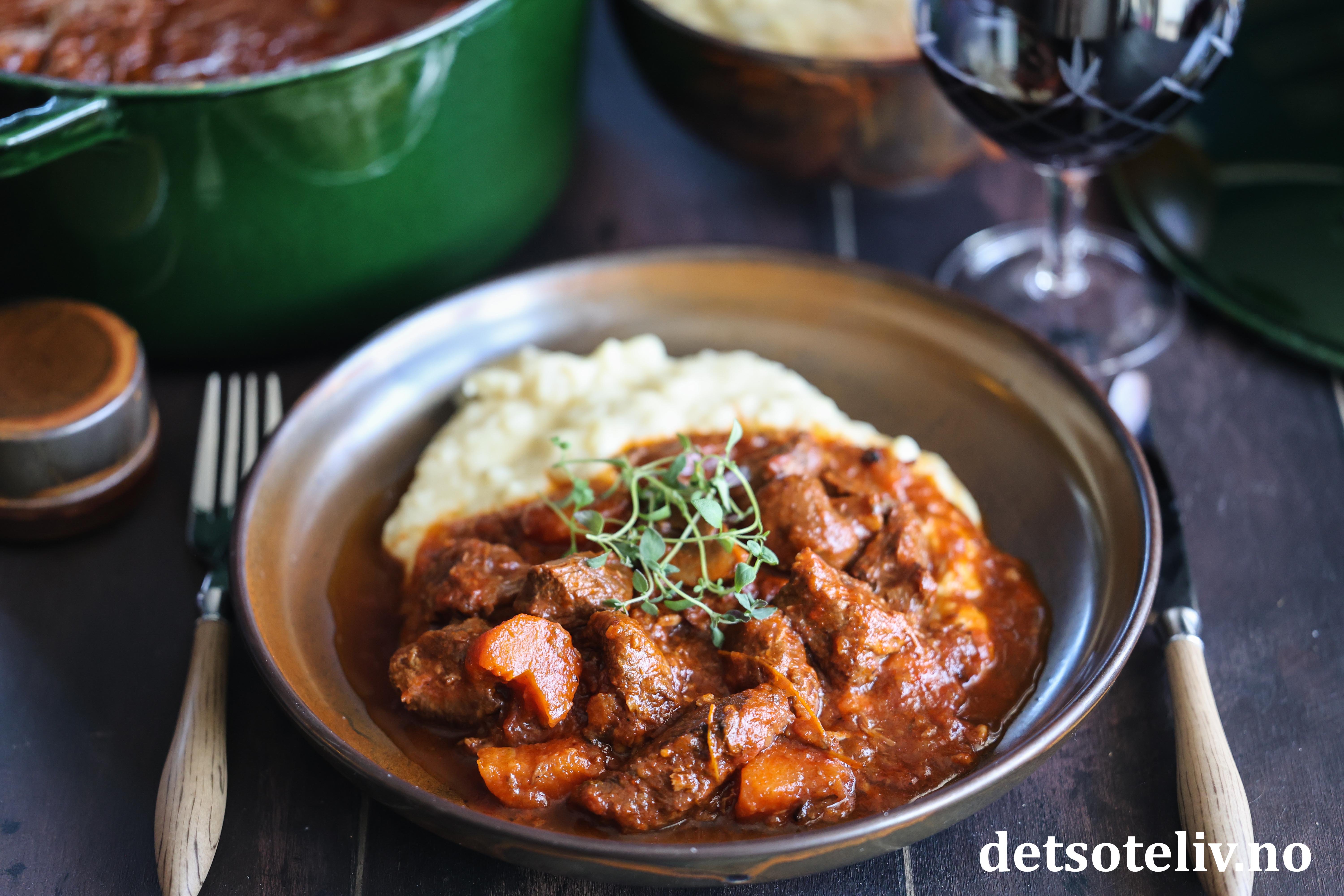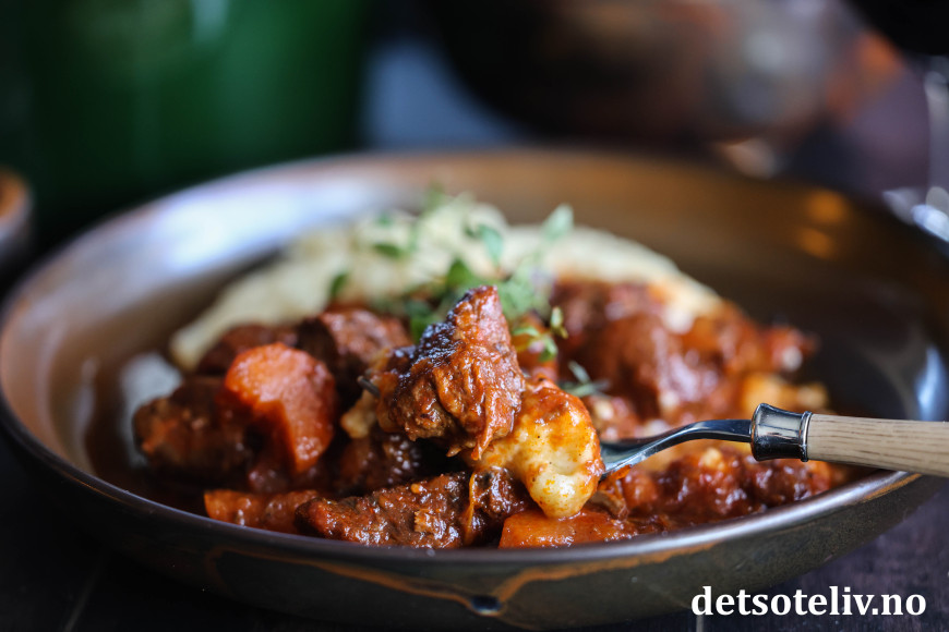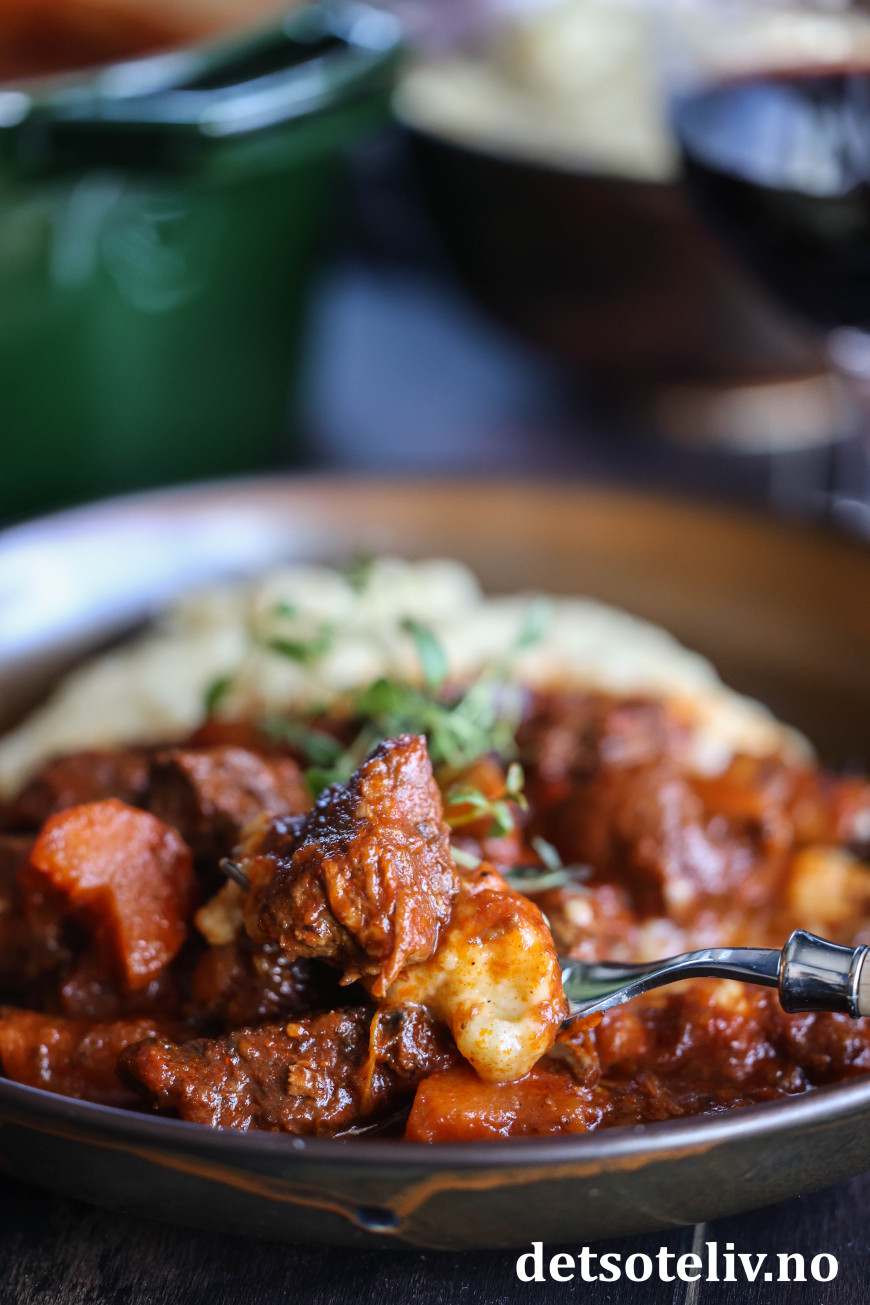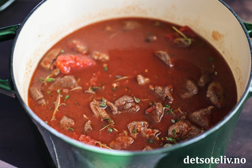Jeg bruker her høyrygg av storfe, som blir utrolig mørt og godt bare det får kokt lenge nok. Sammen med kjøttet har jeg sopp, løk, rotgrønnsaker i gryten, i tillegg til oksekraft og masse tomat som gir en deilig saus. Dette småkoker i minst 2 timer, til både grønnsaker og kjøttbiter er så møre at de nærmest smelter i munnen.