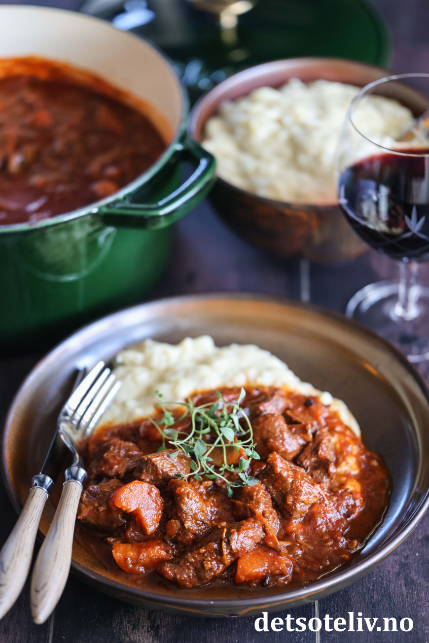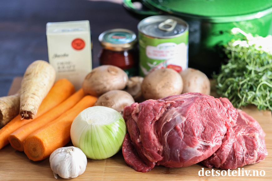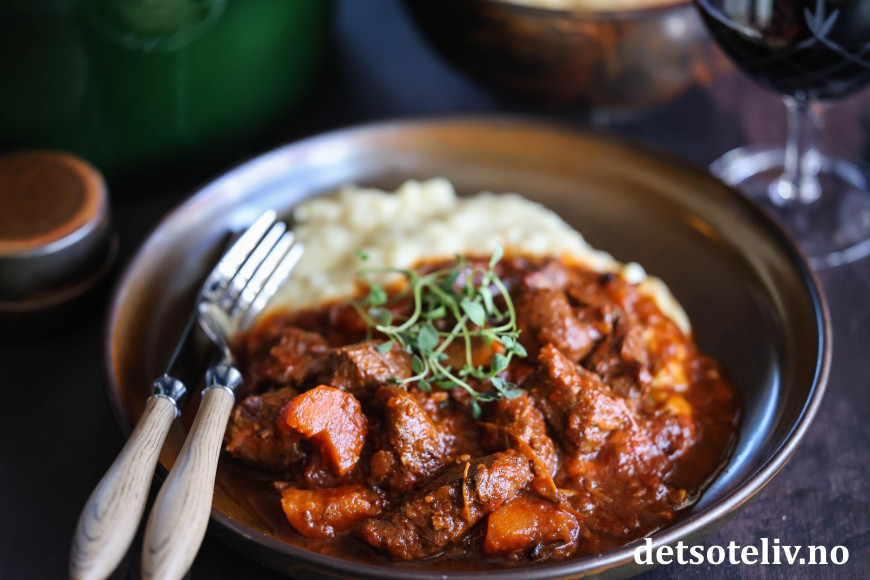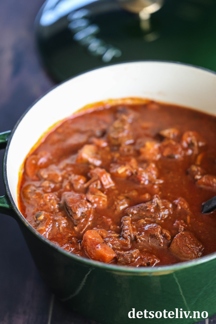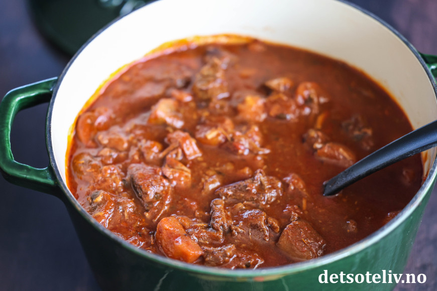 Jeg bruker her høyrygg av storfe, som blir utrolig mørt og godt bare det får kokt lenge nok. Sammen med kjøttet har jeg sopp, løk, rotgrønnsaker i gryten, i tillegg til oksekraft og masse tomat som gir en deilig saus. Dette småkoker i minst 2 timer, til både grønnsaker og kjøttbiter er så møre at de nærmest smelter i munnen.