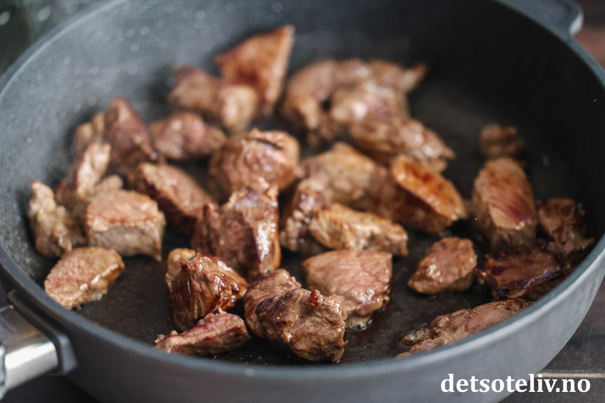 Brun kjøttbitene i olje i en stekepanne på høy varme, slik at de får god stekeskorpe (stek i flere omganger så det ikke blir for fullt i stekepannen).
