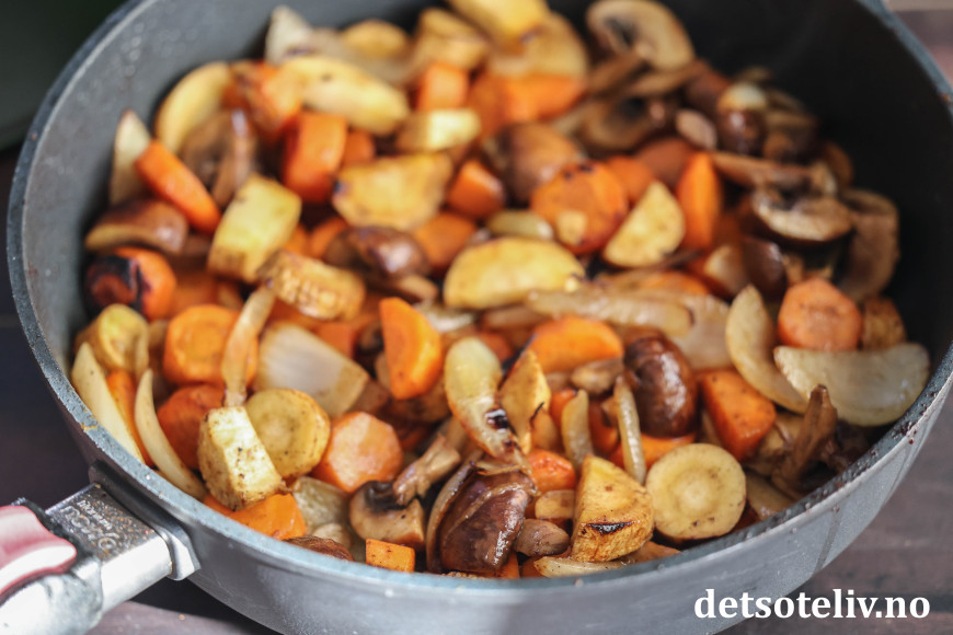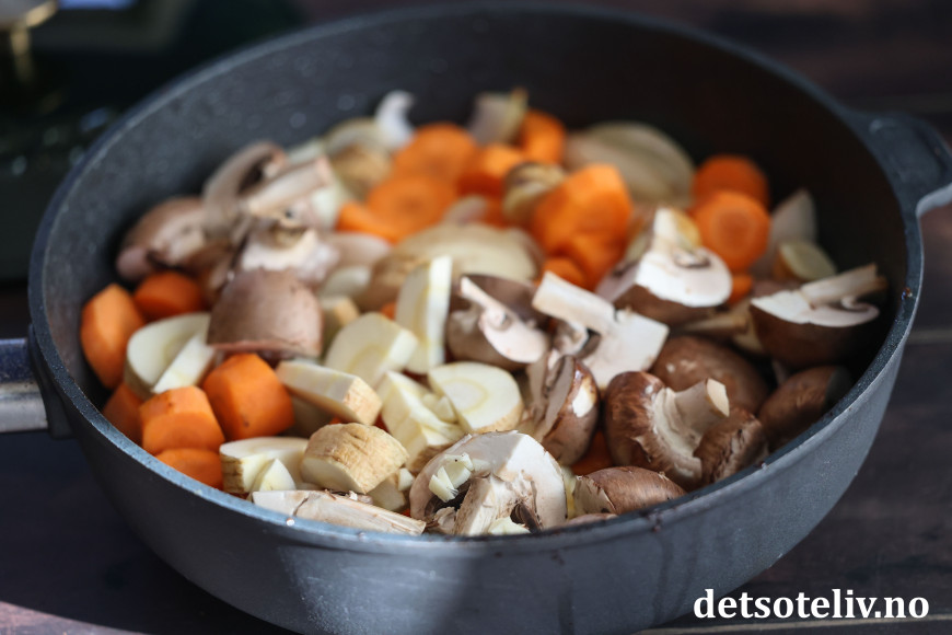 Ha gulrøtter, pastinakk- og soppbitene i pannen.