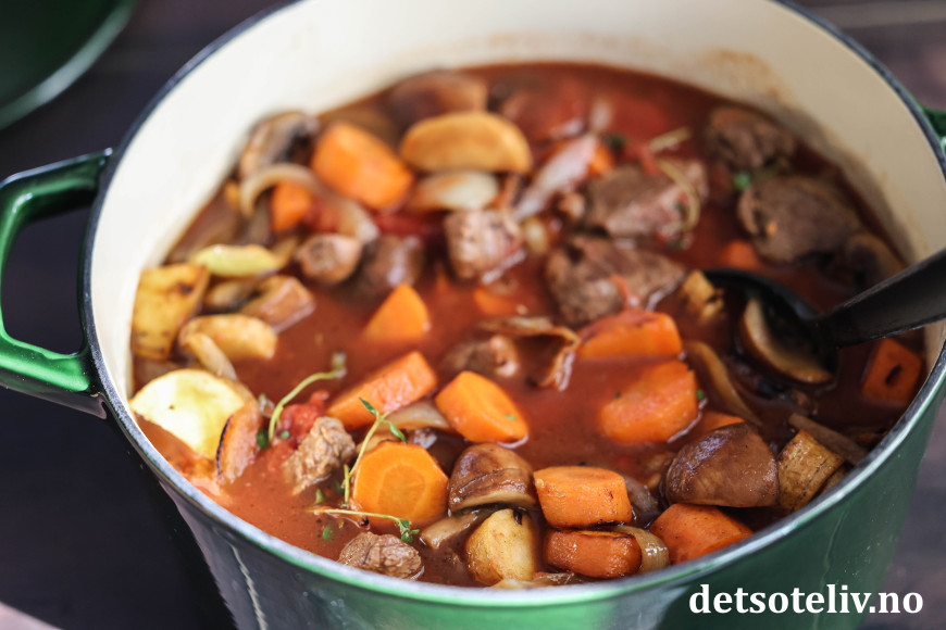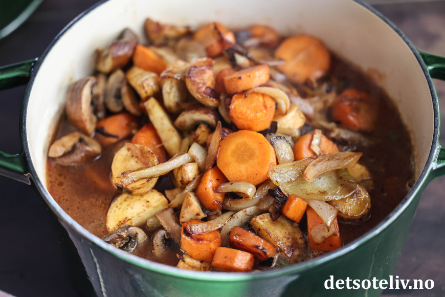 ♥ Jeg har her valgt å koke løk og rotgrønnsaker like lenge som kjøttet. Det gjør at grønnsakene blir så myke at de nesten går i oppløsning, men siden grønnsakene er skjært i store biter, gjør de det ikke helt. Dette gir også litt tykkelse på sausen uten at det trengs noen meljevning. Dersom du foretrekker at grønnsakene er mindre kokte, kan du tilsette dem etter at kjøttet har putret i gryten i 1 time, slik at de bare får ca. 1 times koketid.