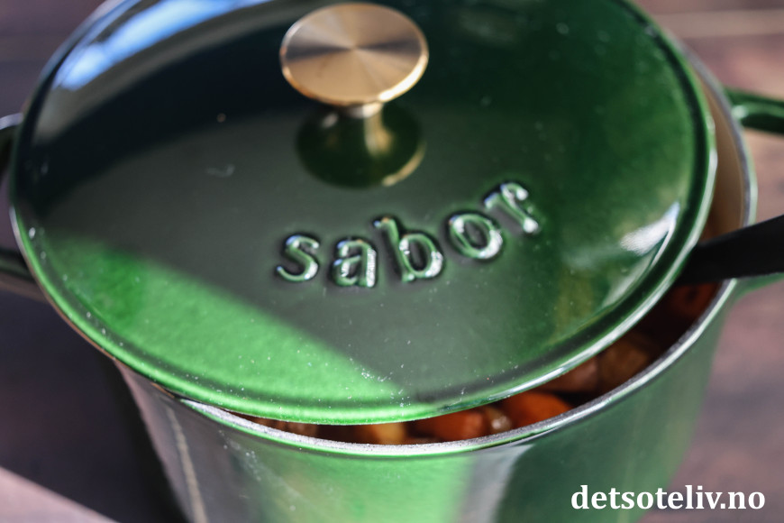 Sett på lokket og la gryten koke opp. Slå ned varmen på platen og la gryten småkoke / trekke under lokk i ca. 2 timer (se tips).