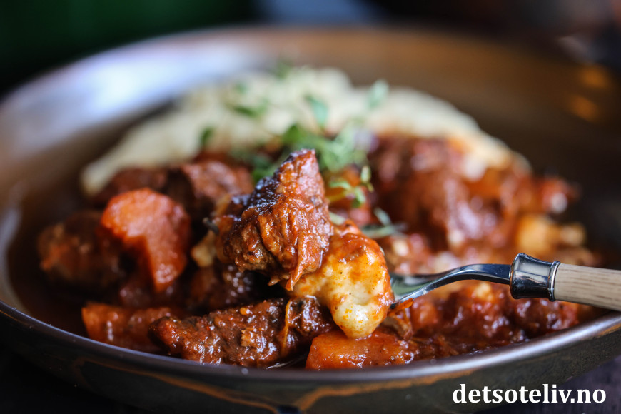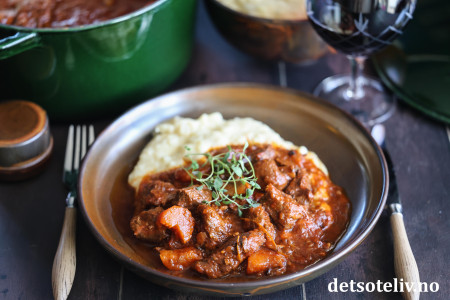 Server kjøttgryten varm med hjemmelaget potet- og sellerirotstappe ved siden av.