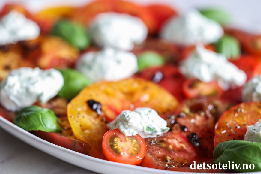 Denne tomatsalaten er nydelig å servere som tilbehør til mange slags sommermiddager!