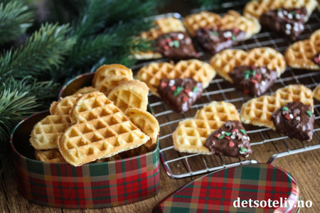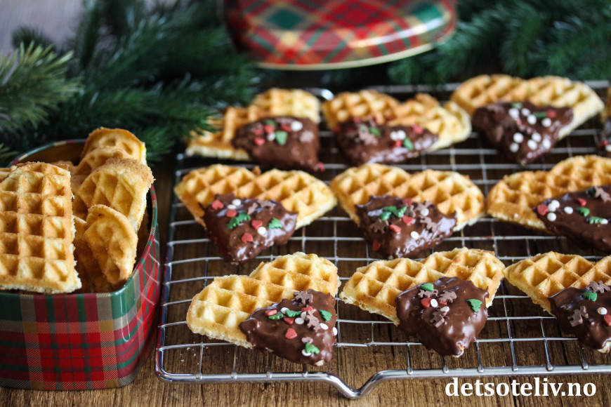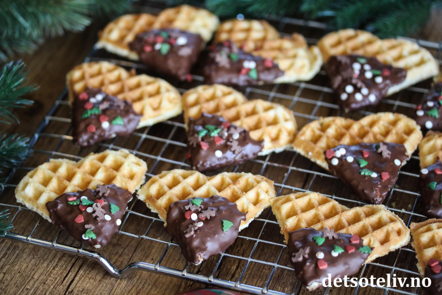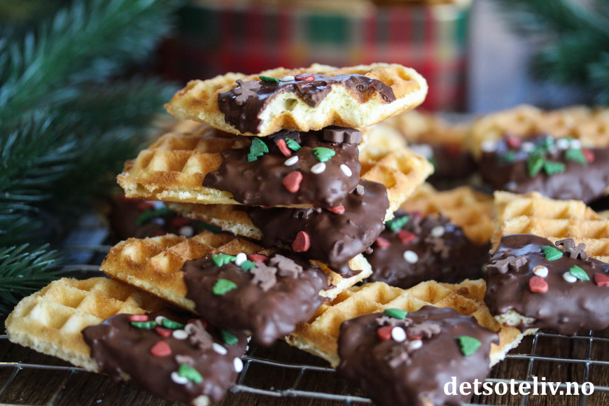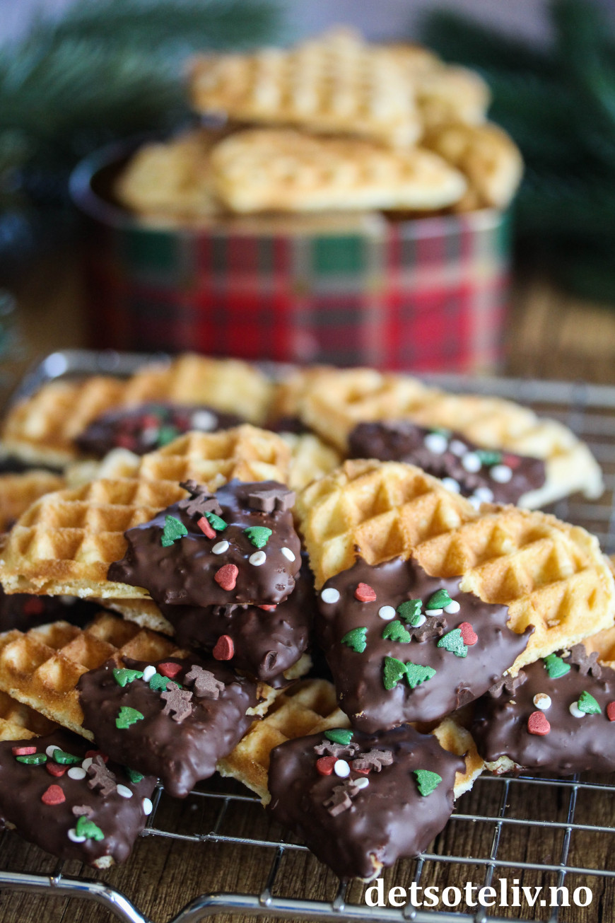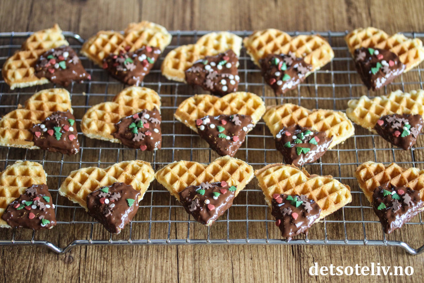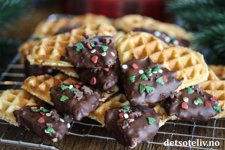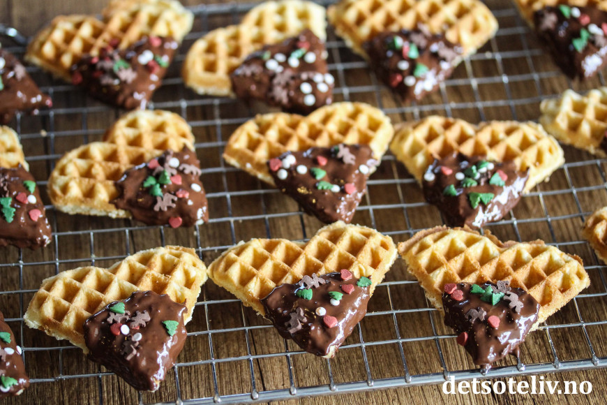 Tørre vafler blir ekstra fine dersom de dyppes i smeltet sjokolade og pyntes med kakestrøssel, men dette er ikke nødvendig.