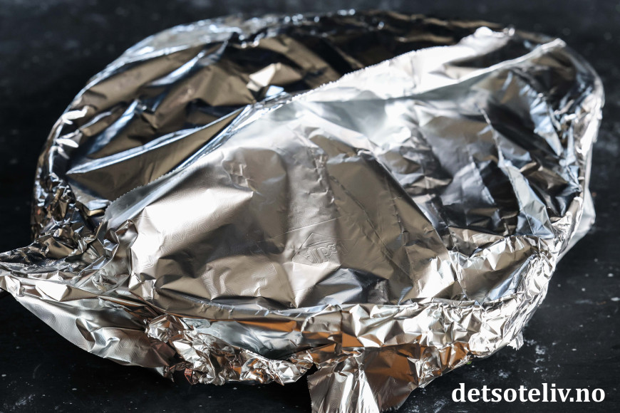 Dekk til formen/pannen med aluminiumsfolie.