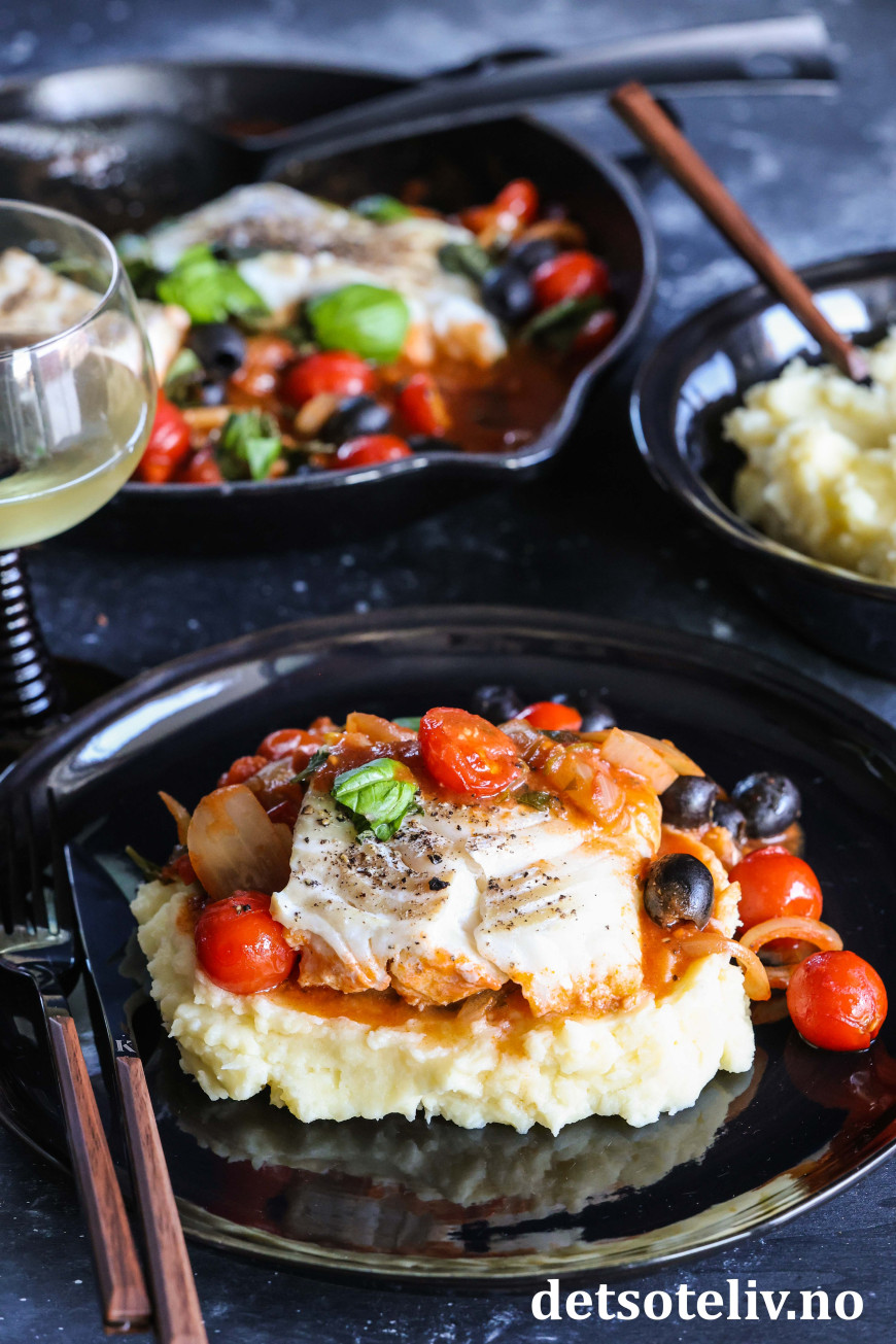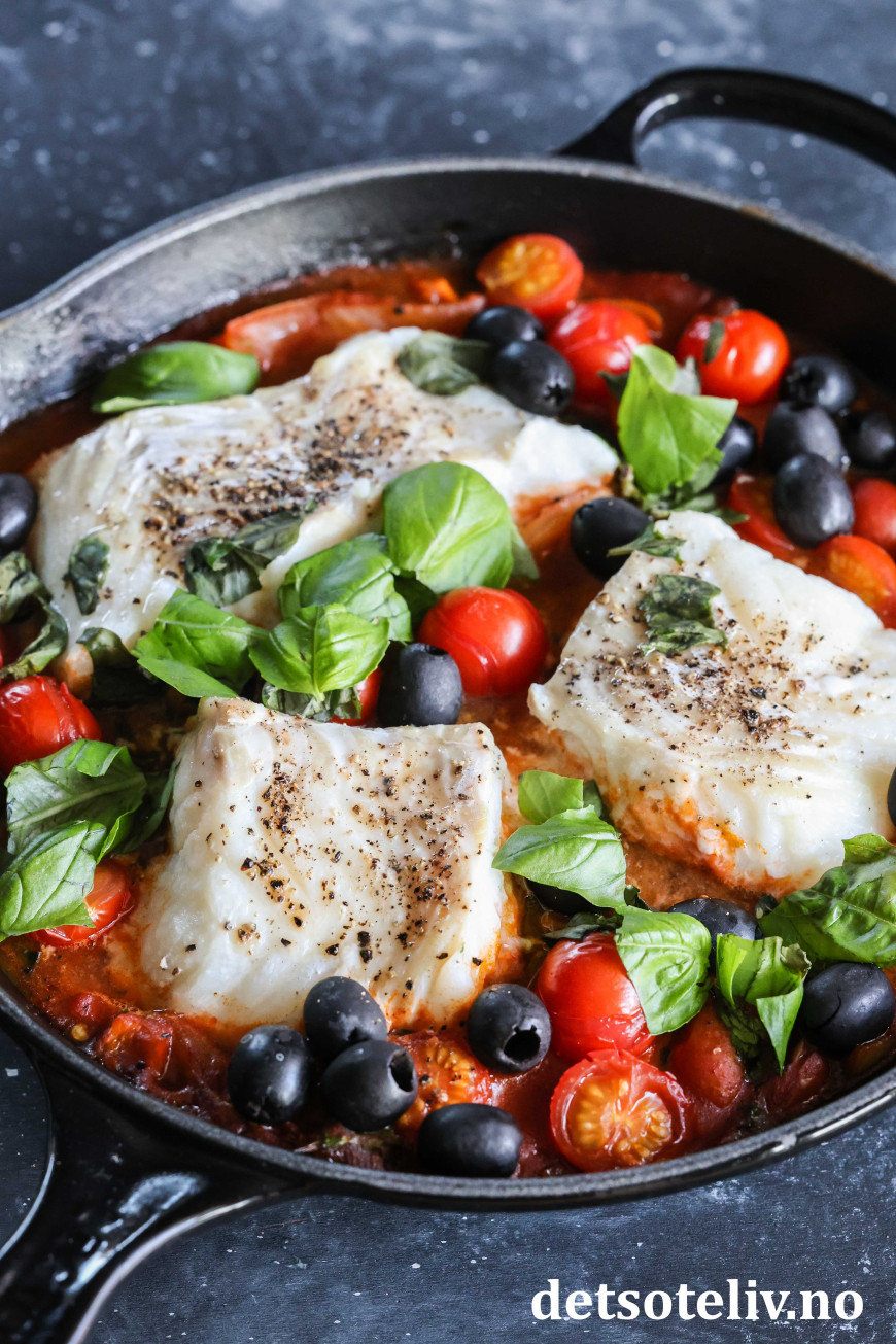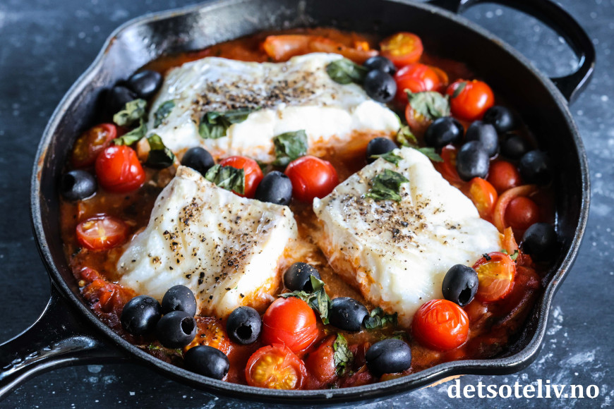 ♥ Jeg brukte her en stekepanne (26 cm i diameter) fra Le Creuset, som tåler å settes i stekeovnen. Det går like fint å bruke en ildfast form (rund 26 cm eller firkantet, ca. 20 x 30 cm). I stedet for å ovnsbake torsken, går det også an å sette lokk på stekepannen og la pannen stå på stekeplaten på middels varme i 20 minutter til torsken er klar.