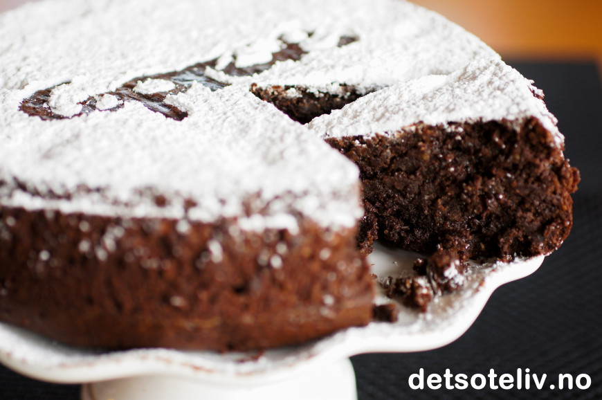 ♥ Denne kaken er mørk og litt bløt og klissete i konsistensen fordi den ikke inneholder noe mel. Det er slik kaken skal være. Det kan være lurt å fukte kniven med jevne mellomrom når du skjærer kakestykker, så kakestykkene blir pene.