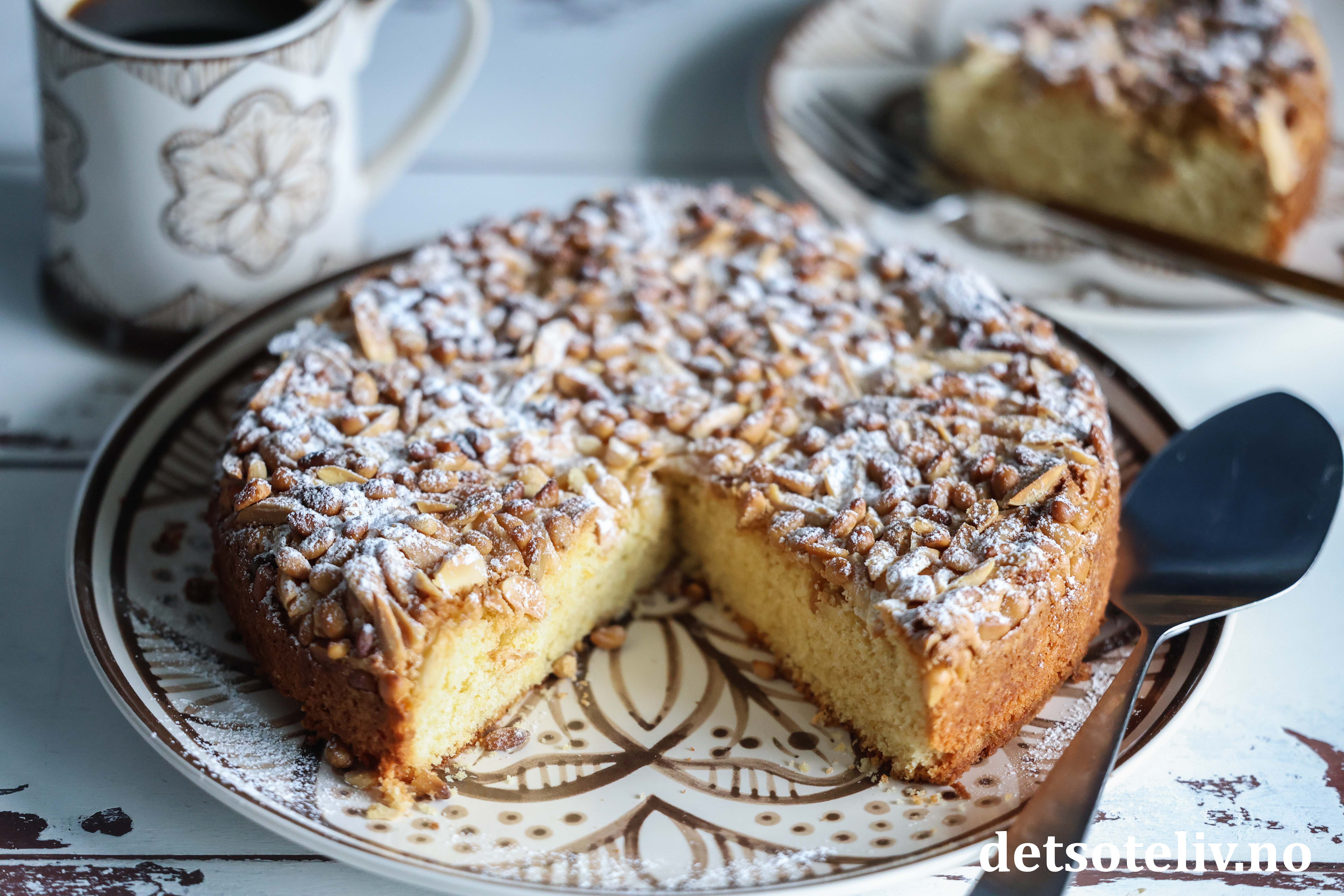 Kaken kjennetegnes av drysset med skåldede mandler og pinjekjerner på toppen. Kaken er en saftig formkake og har deilig smak av sitron.