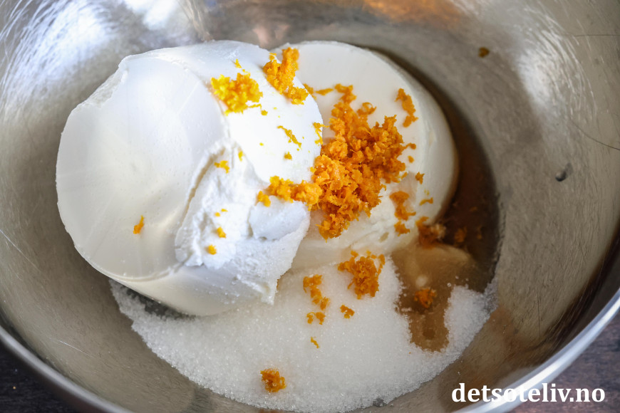 Ha ingrediensene til fyllet i en bolle. Pisk raskt sammen til en glatt krem.