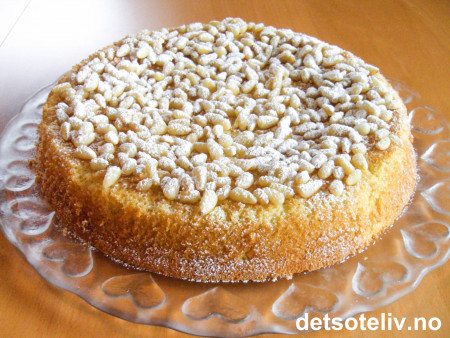Hvis du vil, kan du riste pinjenøttene såvidt i tørr stekepanne på middels varme før du har dem på kaken. Pass nøye på, slik at nøttene ikke blir brente, bare lyst brune.