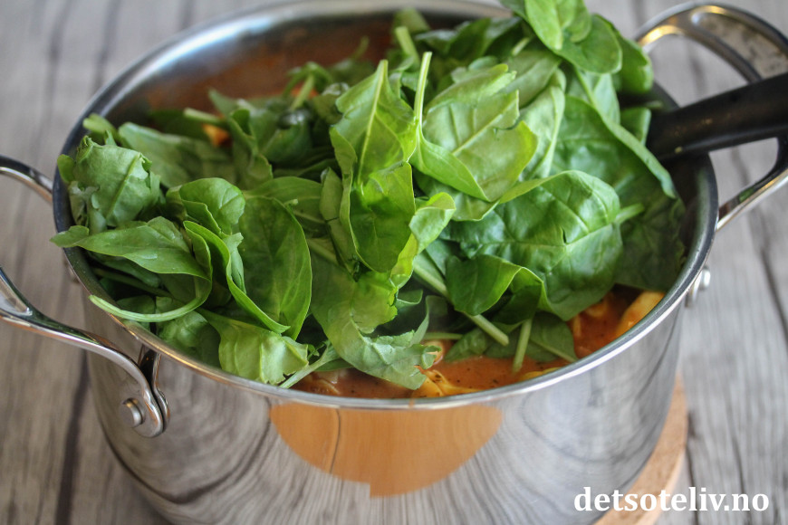 Tilsett spinaten og rør rundt, så den "klapper sammen" og blander seg i suppen.