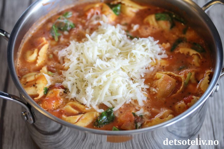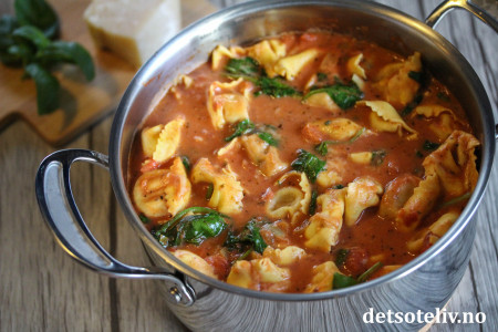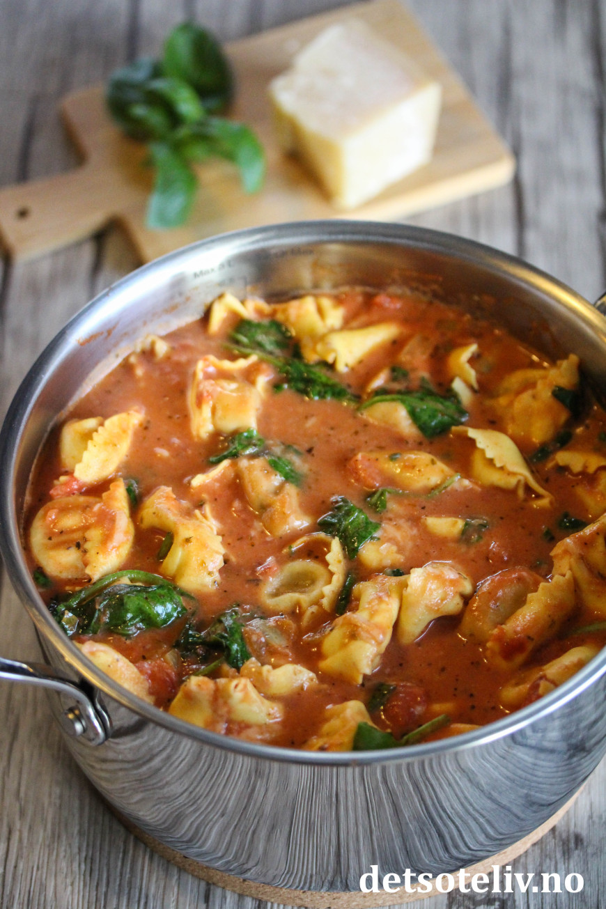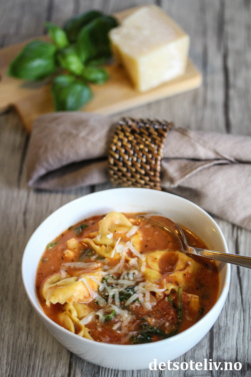 Tortelloni er fylt pasta, som fås kjøpt i flere varianter. Jeg har her brukt ferske tortelloni fylt med tomat og mozzarella i en deilig tomatsuppe. Suppen blir kremete av fløte og revet parmesan, og fersk spinat gir litt grønt.