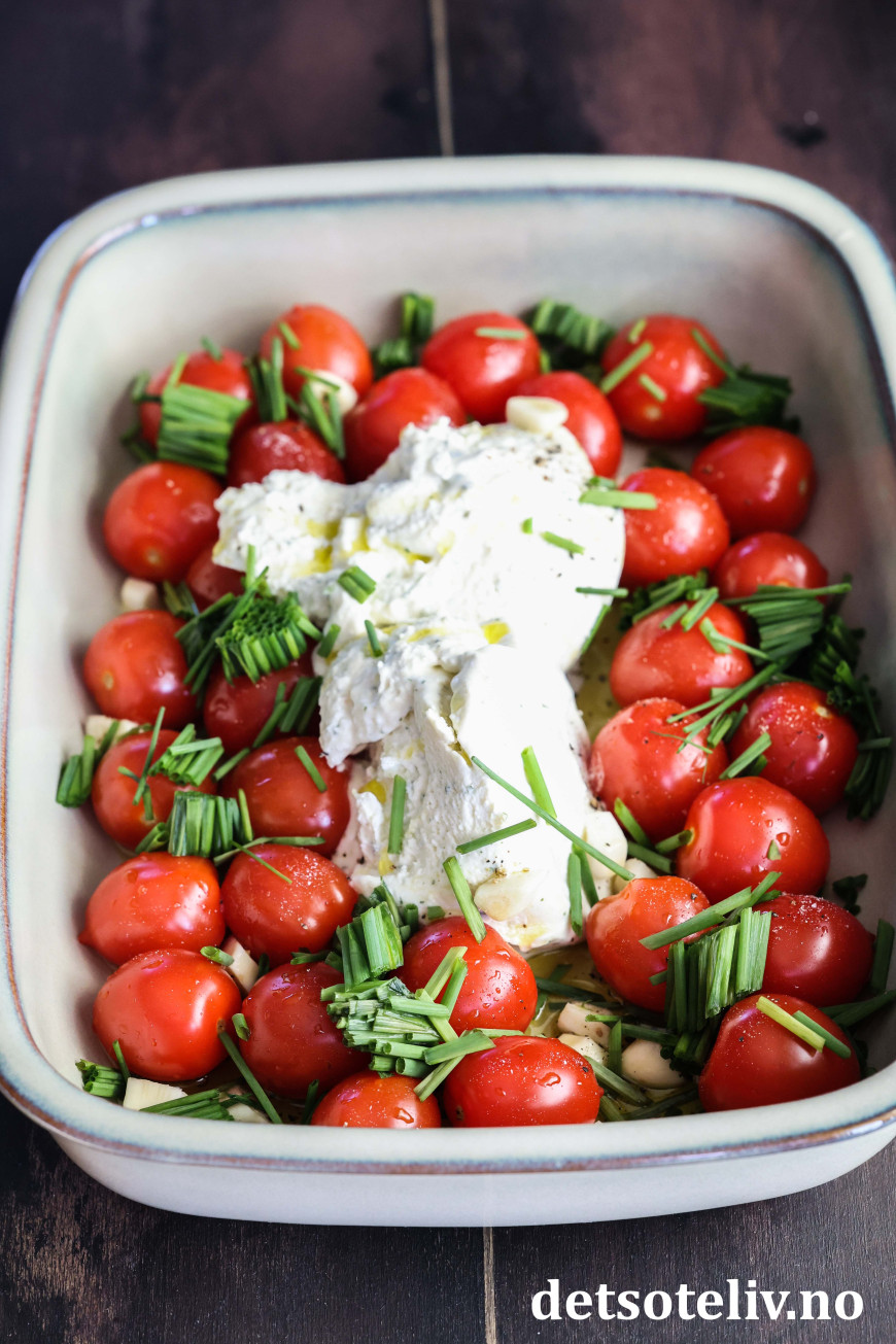 Ha tomater i en ildfast form (ca. 20 x 30 cm). Legg kremosten i midten av formen. Dryss over hakkede hvitløksfedd og gressløk. Drypp over olivenolje og kvern over salt og pepper.