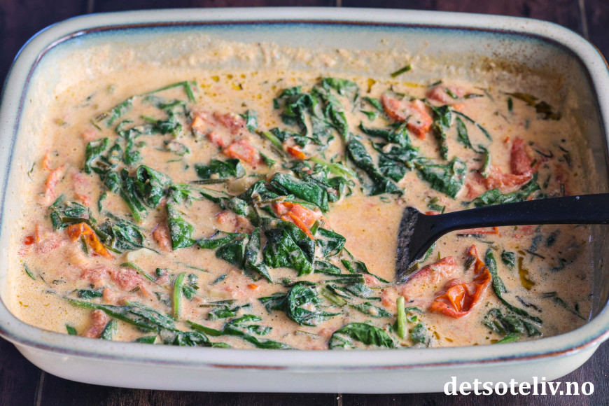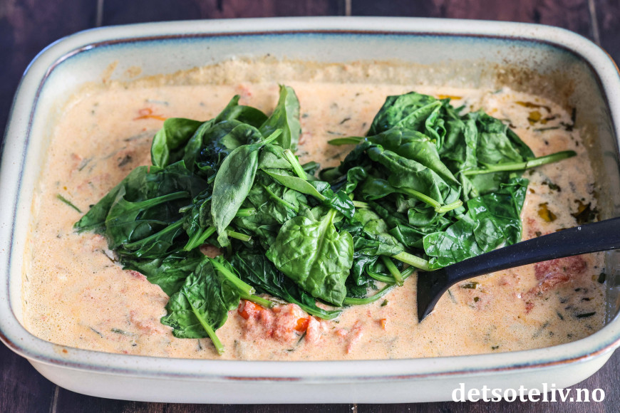 Vend inn spinatbladene (de vil "klappe sammen" i volum når de vendes inn i den varme sausen).