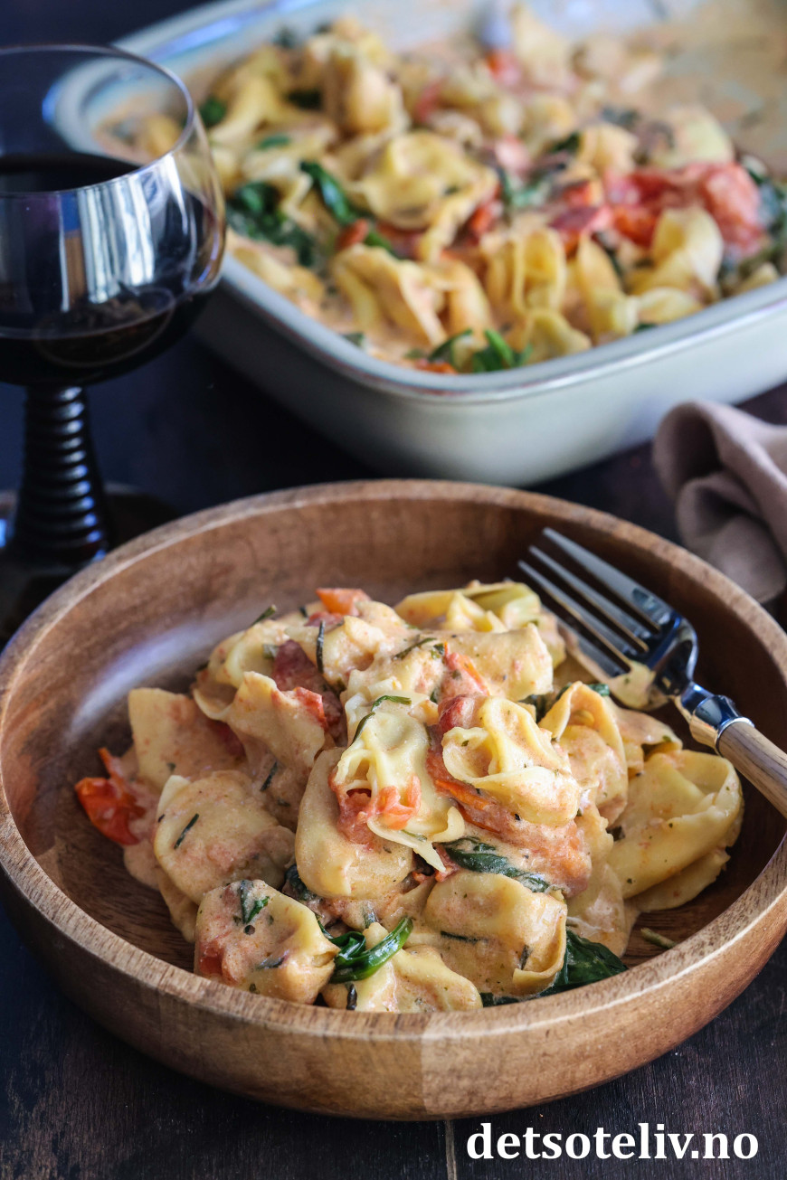 Tortelloni er fylte pasta som er litt større enn tortellini, men begge deler går fint å bruke. Jeg brukte tortelloni med ostefyll som er min favoritt, men bruk de du liker best! Fylte ravioli kan også brukes.