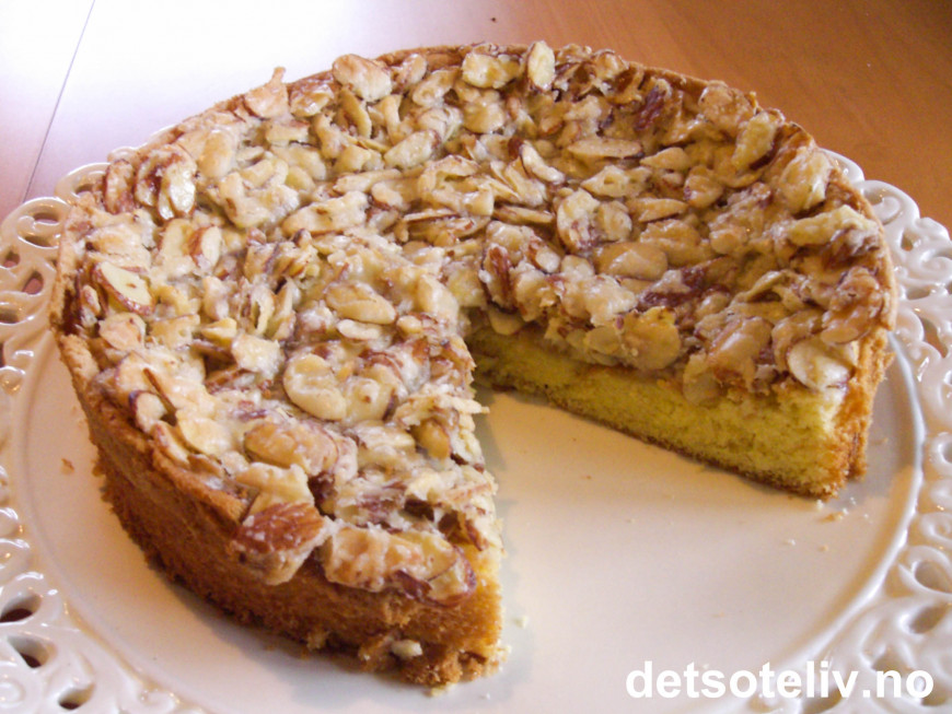 Kaken kan lages med hakkede mandler i stedet for mandelflarn.