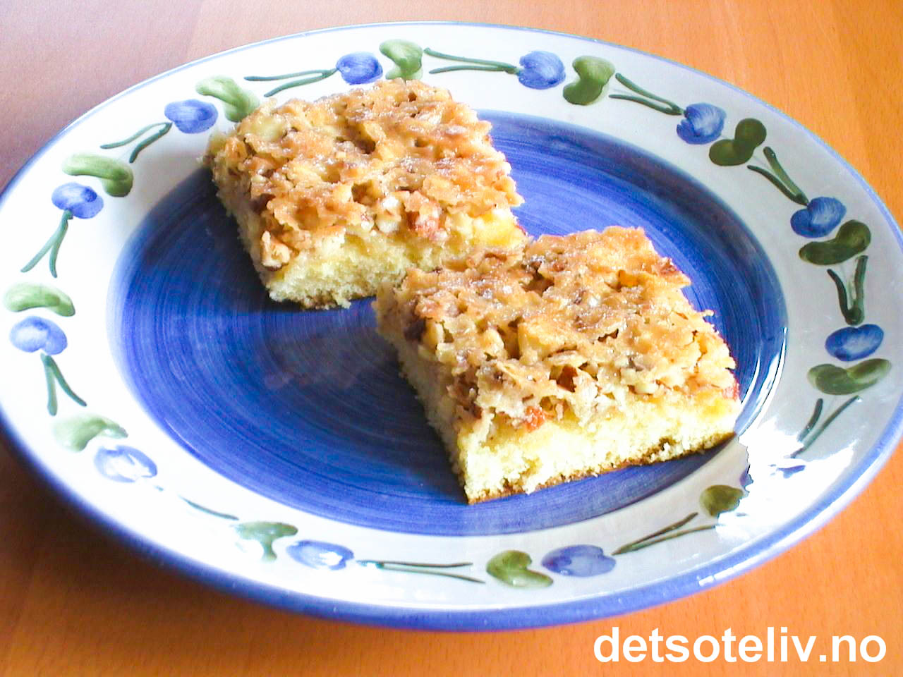 Fordel mandeltoppingen jevnt oppå den halvstekte kaken. Stek kaken videre på midterste rille i ovnen ved 180°C i ca 20 min til. Avkjøl kaken helt i formen. Ta kaken ut av formen og fjern bakepapiret. Del kaken opp i firkanter.