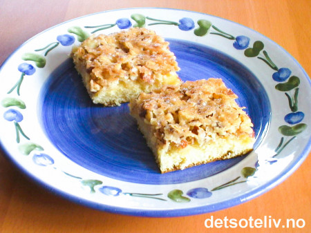 Fordel deigen jevnt utover i en bakepaprikledd, liten langpanne (ca 20x30 cm). Stek kaken nederst i ovnen ved 180°C i 15 min.