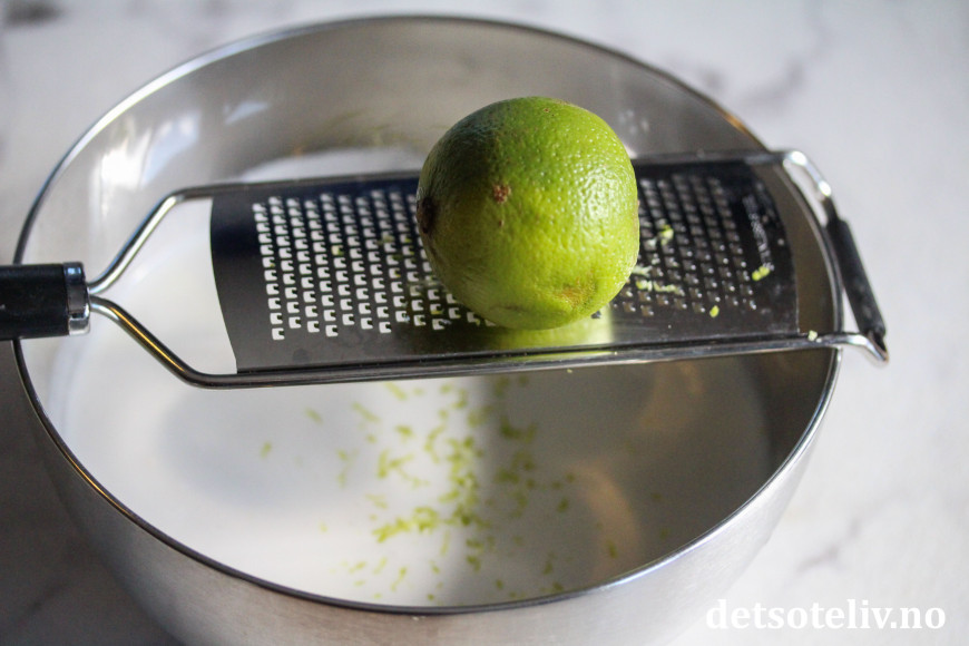 Smelt smøret og bland det med melken og fint revet skall av lime. Vend dette inn i eggedosisen.