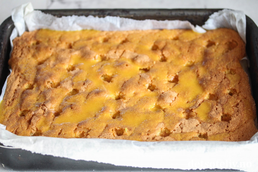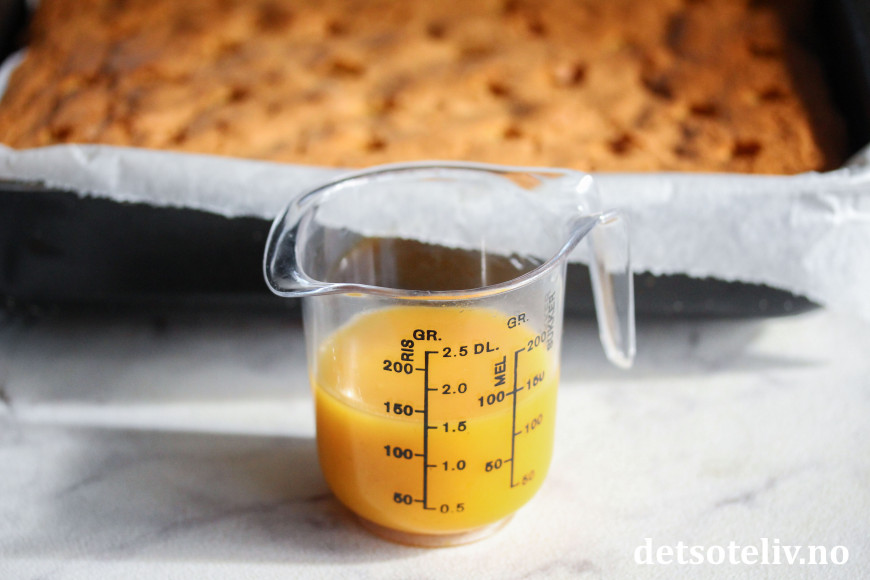 Hell pasjonsfruktjuicen over den varme kaken og la juicen trekke inn i kaken i 3-4 minutter.
