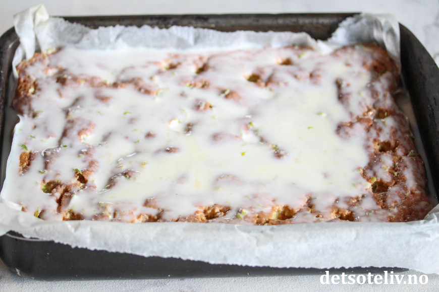 Bland sammen helmelk, søtet kondensert melk, kokosmelk, fint revet limeskall og rom. Hell også dette over kaken.