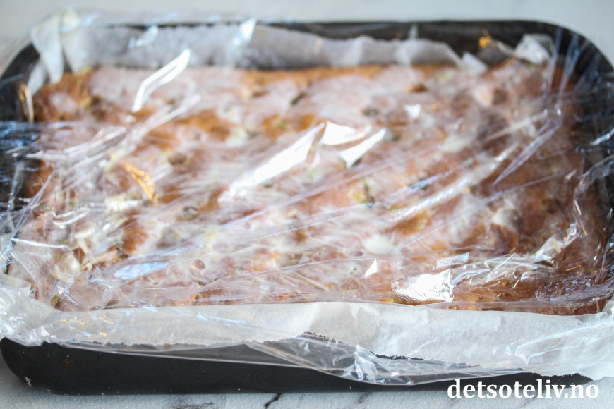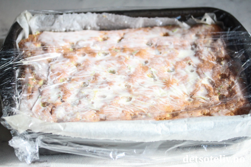 Dekk til kaken med plastfolie og sett den i kjøleskapet, helst til dagen etter, og minst i 5 timer.