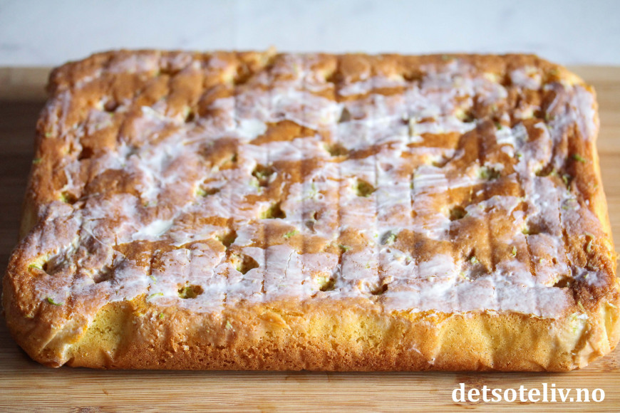 Pisk egg og sukker til skikkelig tykk eggedosis. Smelt smøret og bland det med melken og fint revet skall av lime. Vend dette inn i eggedosisen. Sikt mel og bakepulver sammen, og vend også dette forsiktig inn i eggedosisen.