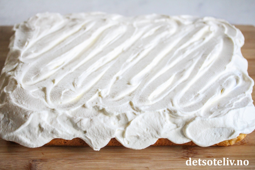 Pisk kremfløte og melis til tykk fløtekrem. Bre kremen over kaken i et jevnt lag.