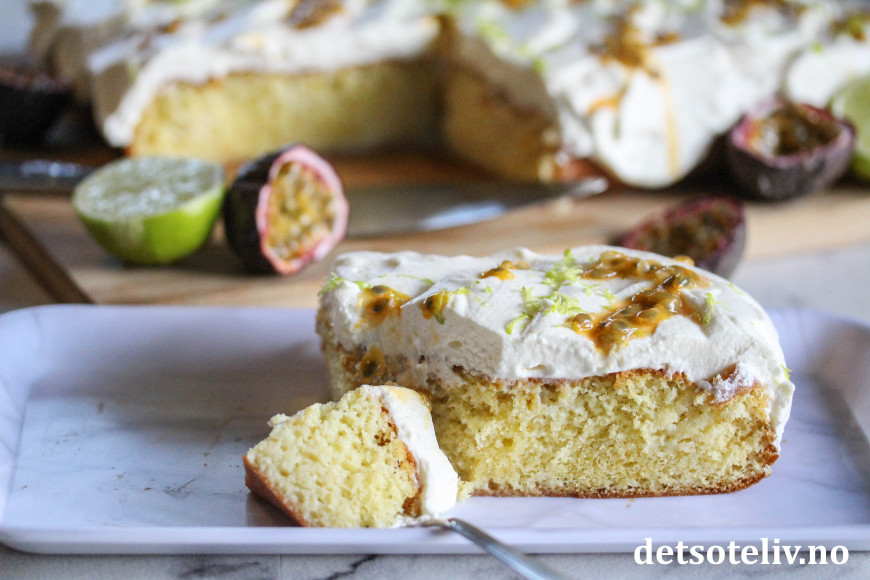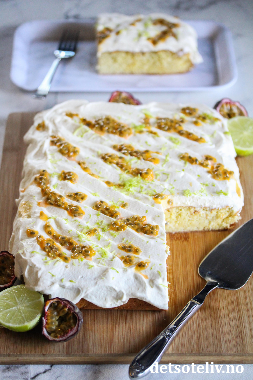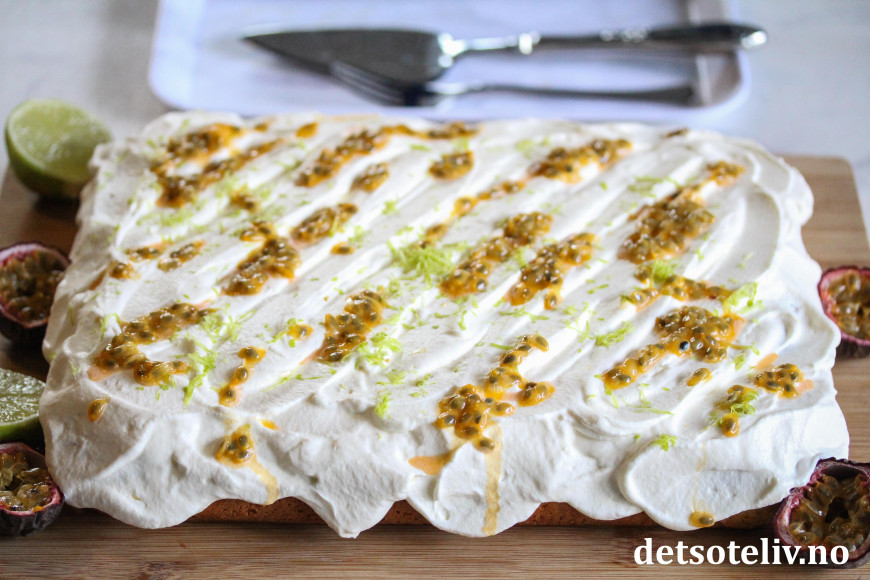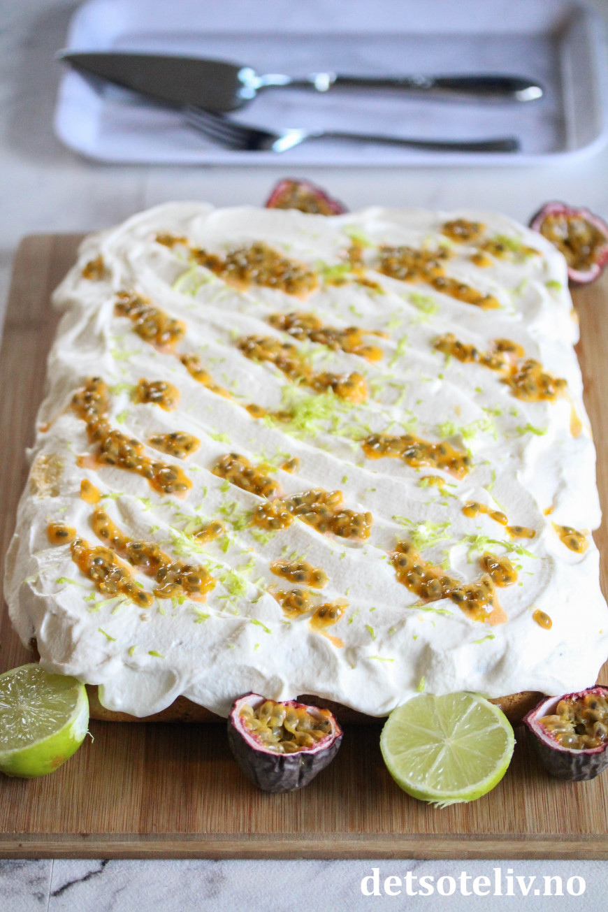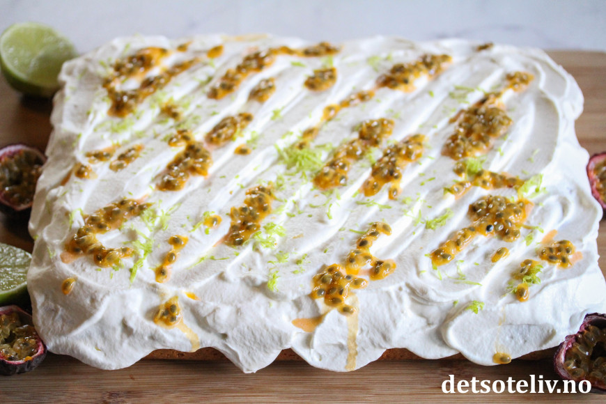 Kaken smaksettes også med lime, pasjonsfruktjuice, kokos og rom før den dekkes med pisket fløtekrem, lime og pasjonsfrukt.