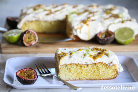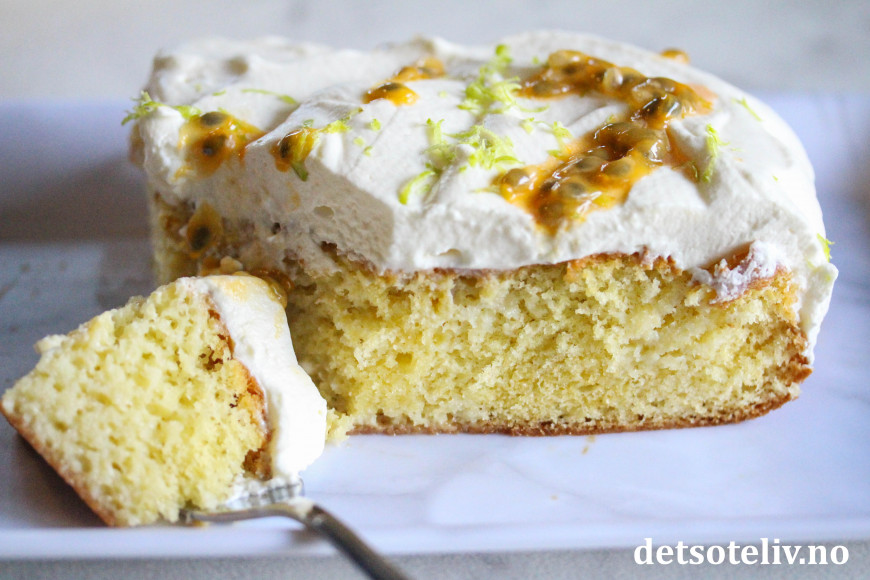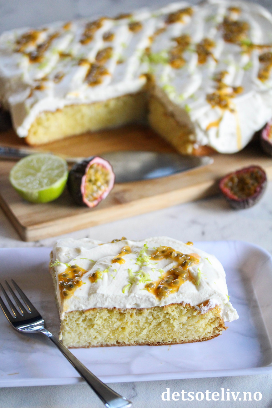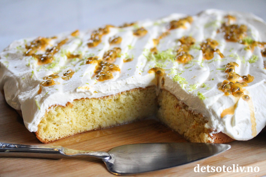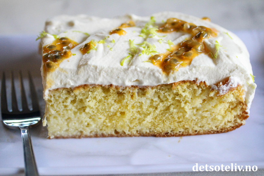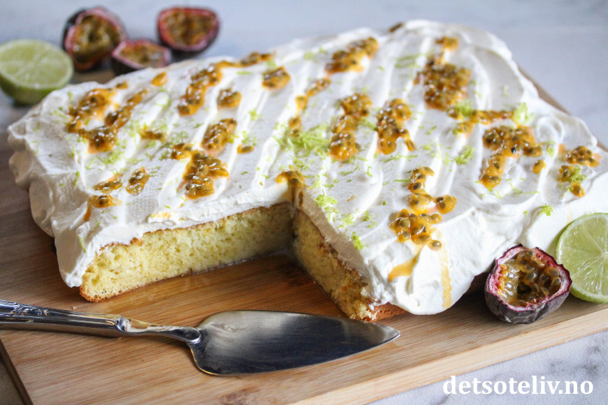 Kaken smaksettes også med lime, pasjonsfruktjuice, kokos og rom før den dekkes med pisket fløtekrem, lime og pasjonsfrukt.