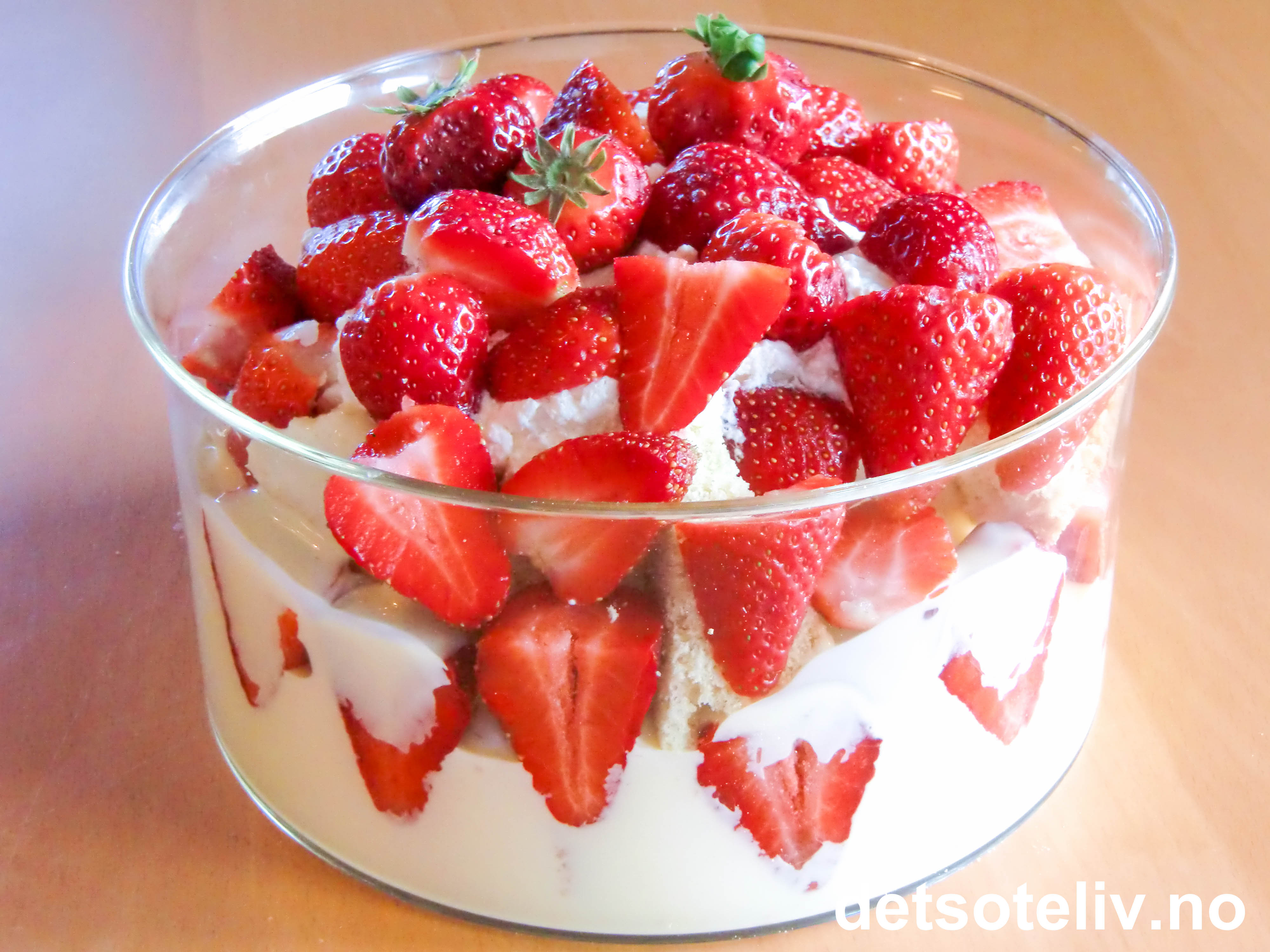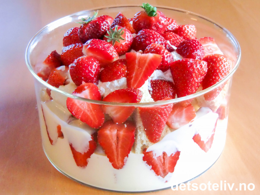 Legg så et lag med kake i bunnen av en stor glassbolle. Dynk med litt melk eller likør. Ha så over rensede jordbær og eventuelt litt syltetøy. Fordel deretter over vaniljekrem og pisket krem. Legg på et nytt lag med kake og gjenta så mange ganger du ønsker. Pynt med masse jordbær på toppen.