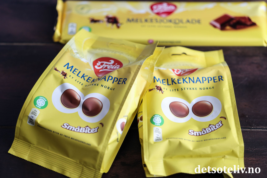 ♥ Jeg brukte her melkeknapper (2 pk à ca. 150 gram) og melkesjokolade (200 gram) fra Freia. Du kan bruke andre varianter av sjokoladebiter også, eller hakket opp sjokoladeplate. Bruk en blanding av lys og mørk sjokolade hvis du foretrekker det.