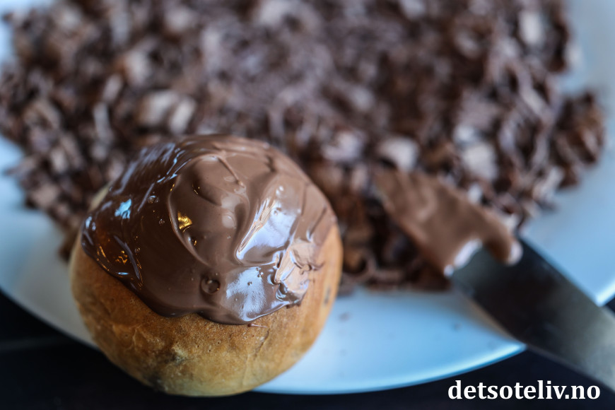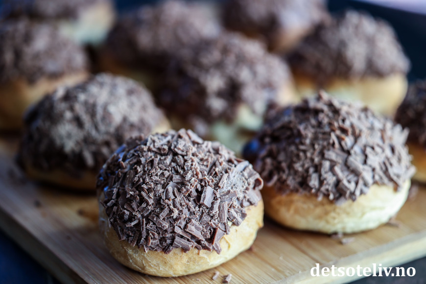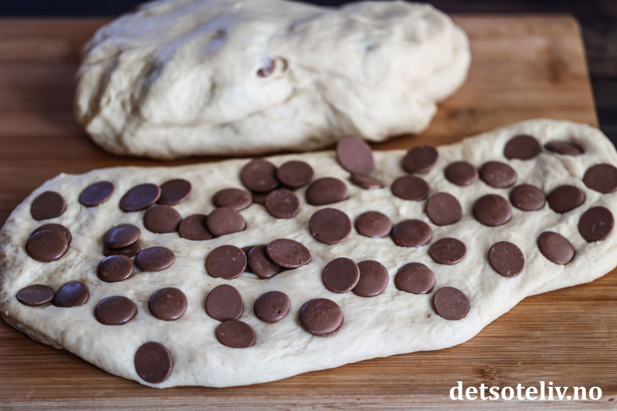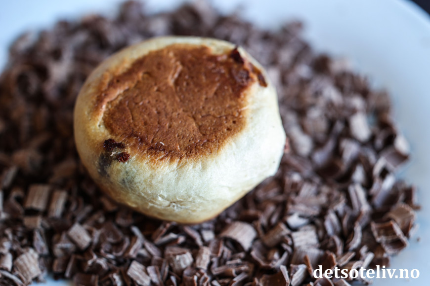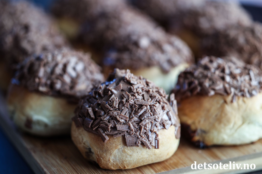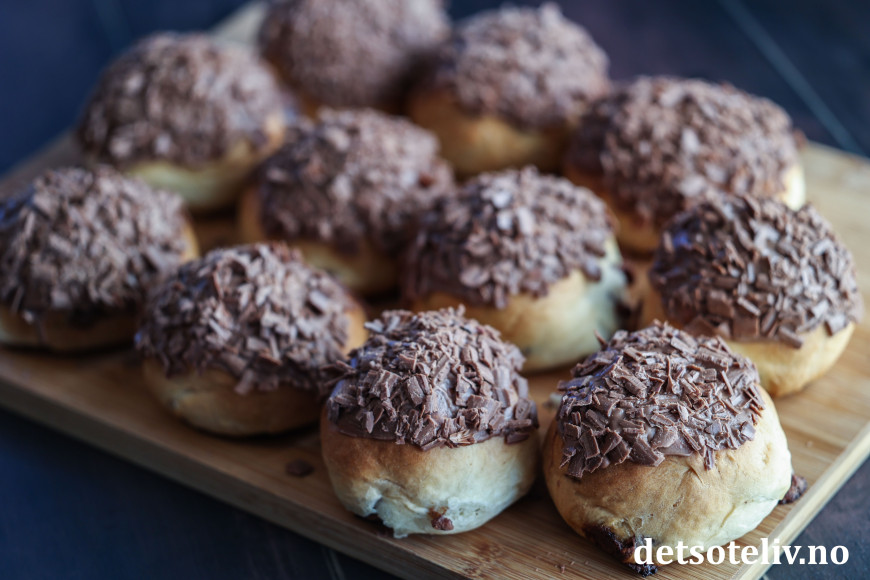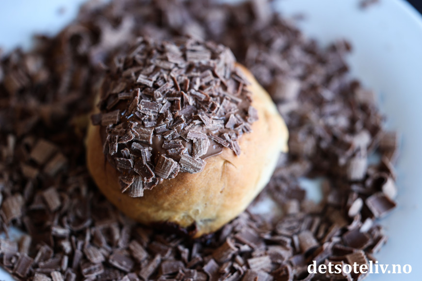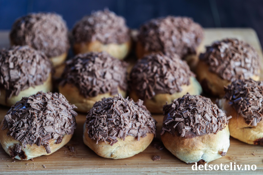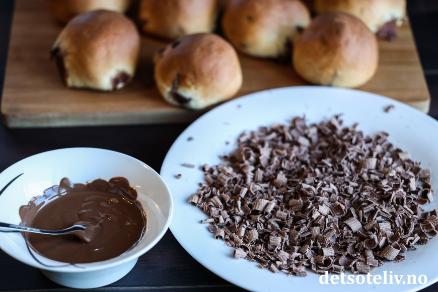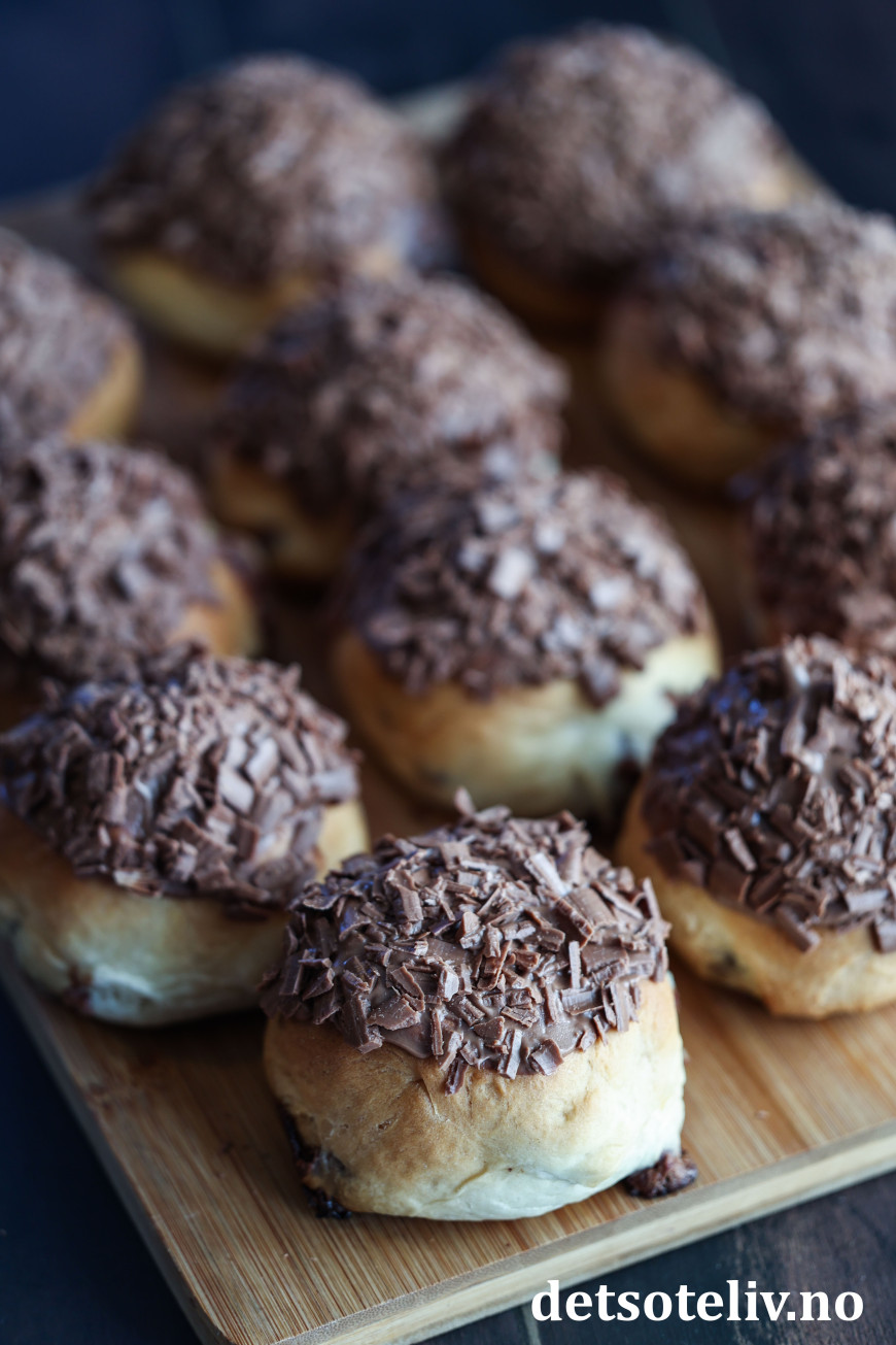 Jeg har brukt min favoritt-bolledeig til Verdens beste boller (riktignok bare halv porsjon), og har først eltet inn masse melkesjokoladeknapper i deigen. Etter at bollene var ferdigstekte, smurte jeg på med smeltet melkesjokolade og dyppet bollene deretter ned i høvlede melkesjokoladeflak.