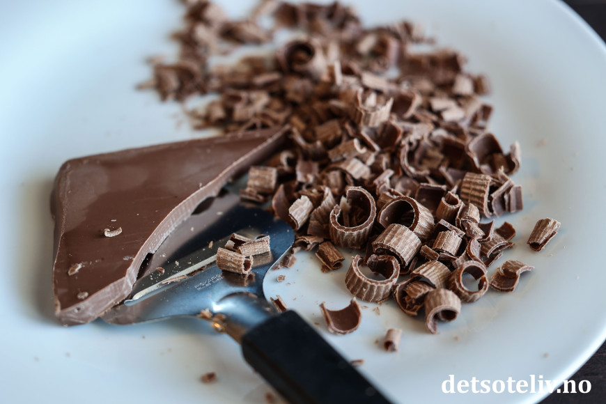 ♥ For å få høvlet spon av melkesjokoladeplate med en ostehøvel, er det lurt at melkesjokoladeplaten er romtemperert. Da er den nemlig mye mykere enn om den er kjøleskapskald, og derfor lettere å høvle opp.