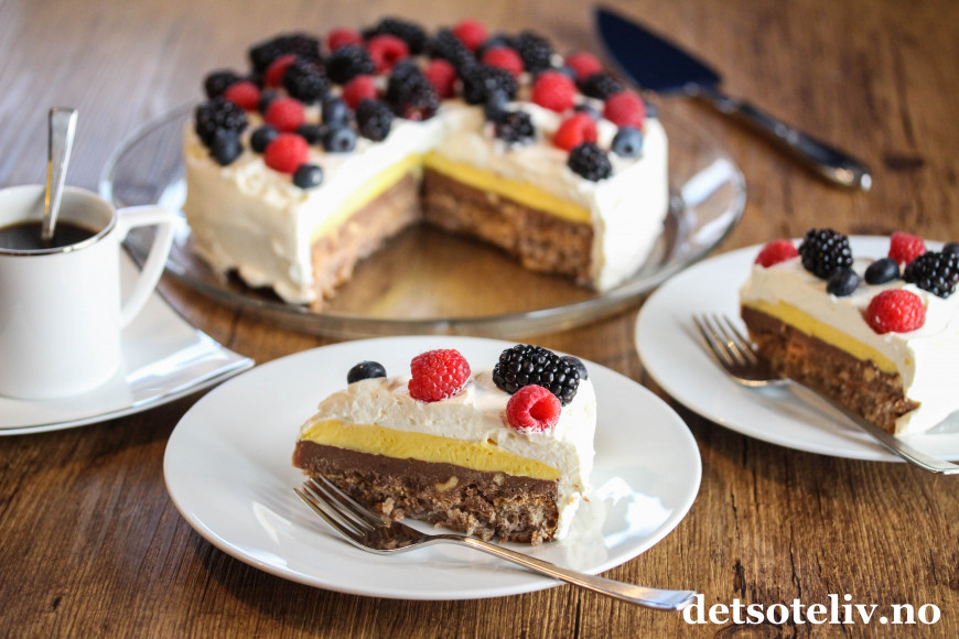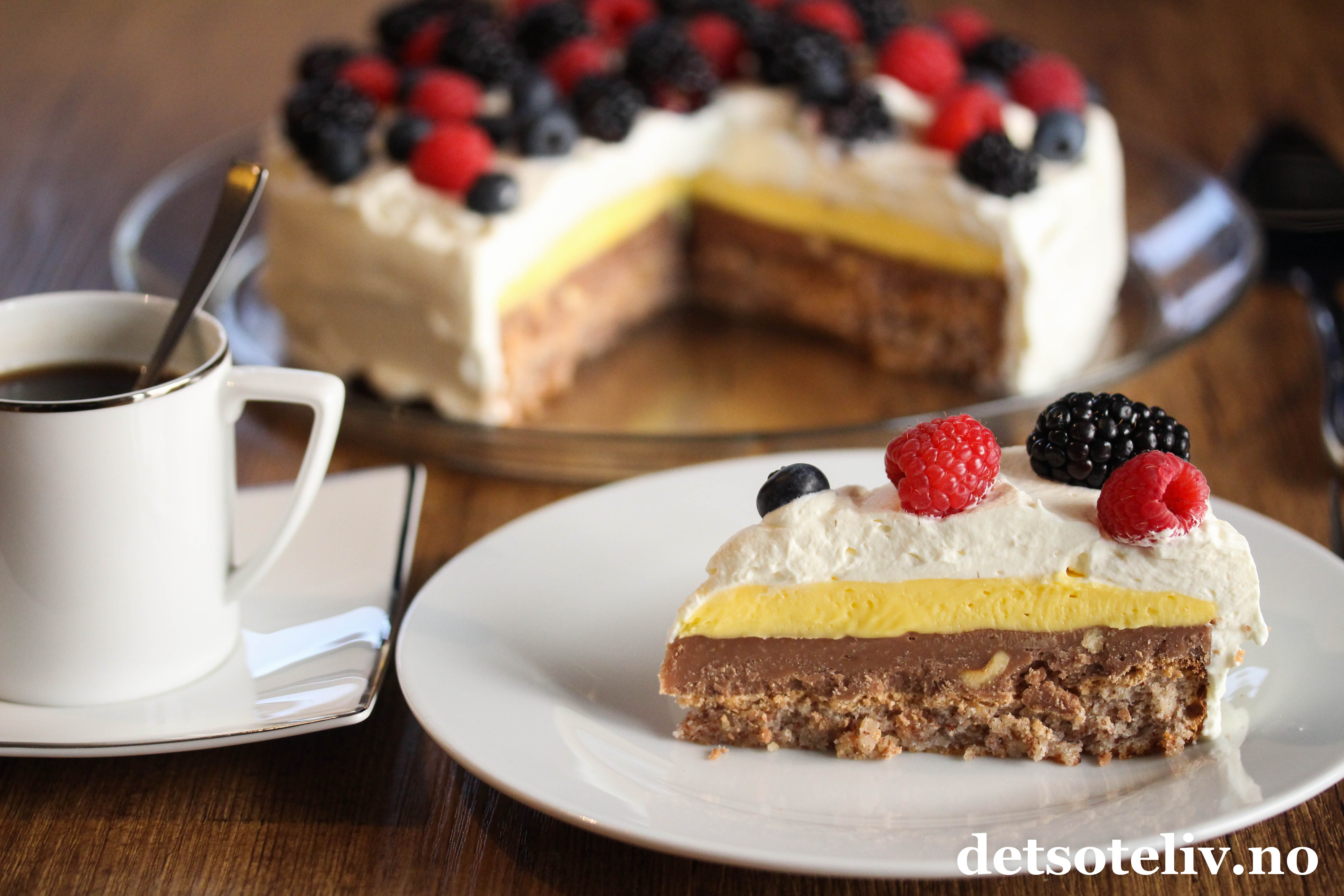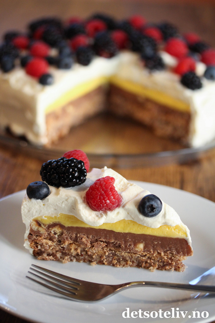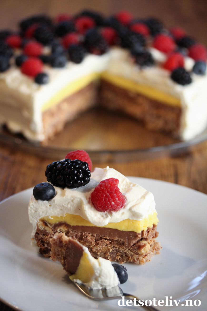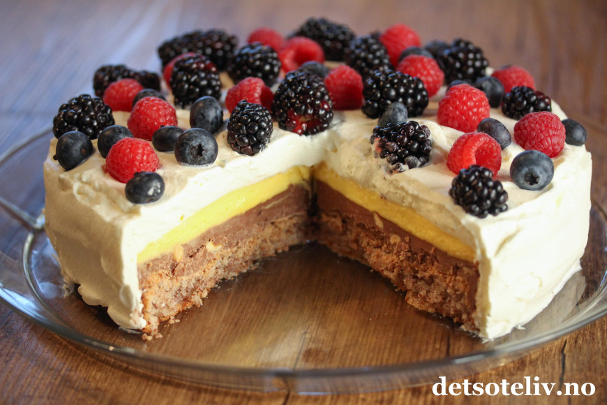 Trippelkremkake toppes med friske bær, og heldigvis er dette noe som vi nå kan få tak i året rundt.